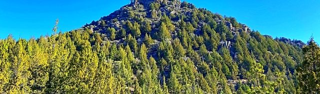 We descended off the summit’s southeast side, downclimbing down-sloping granite slabs for roughly 100 feet. After the downclimbing the slabs, we descended the sandy, mostly open, pine-covered slopes to Stobie Gulch.