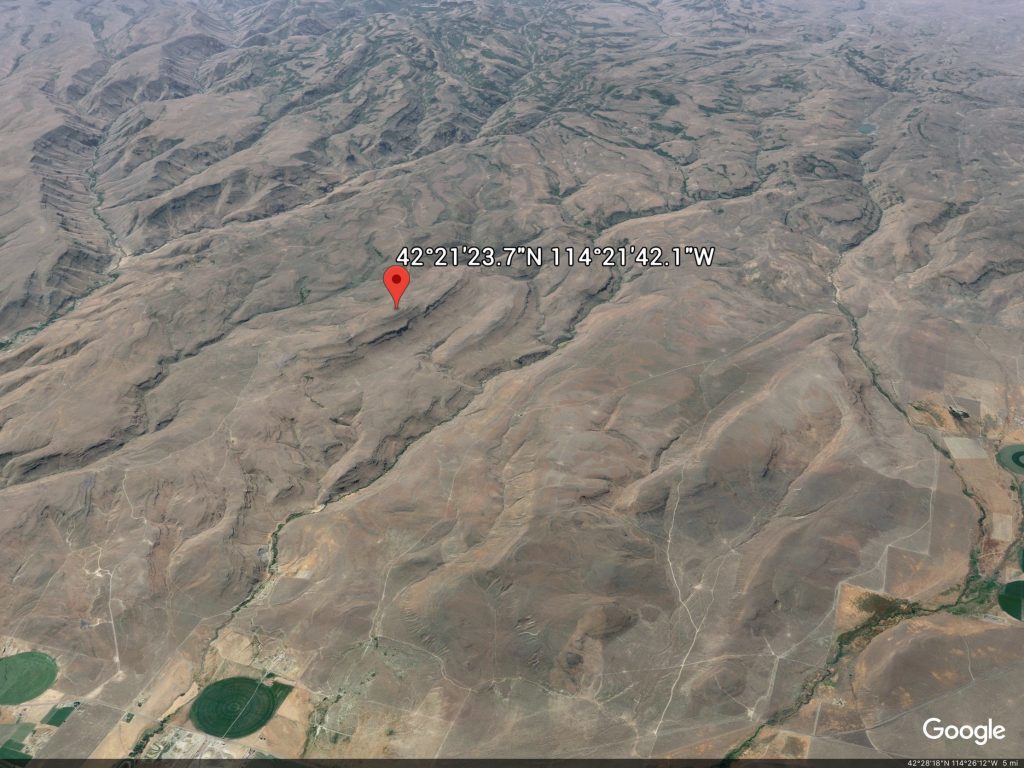 From the junction of US-30 and Rock Creek Road in Hansen, ID, drive south on Rock Creek Road for 11.3 miles and park in a paved pullout with stacked mailboxes alongside it (4,300 feet). This pullout is 1.2 miles north of the crossing of Rock Creek. There is a lot of private property in this area so be careful. This route avoids any private property issues and is entirely on BLM land.
