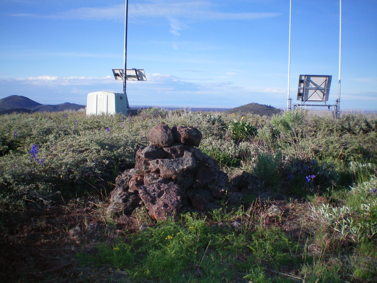 From the large parking pullout, walk southwest on US-20 to the gated road on the north side of the highway. Wilderness permit in pocket, walk briefly up this road to reach the base of the southeast face. Leave the road and bushwhack west up through thick sagebrush and prickly brush to reach the summit. On the summit, you will find an antenna installation. Sunset Cone also has a USGS benchmark on its southeast face (Sunset Benchmark). There are two repeaters up here. There was no summit cairn so I built a small one.