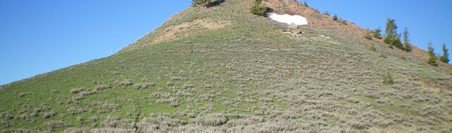 Swede Peak is a handsome, rocky hump that sits at the head of the Buckhorn Creek and Kale Creek drainages. It is overshadowed by its higher neighbors to the north on a long, high ridgeline–Peak 8569 and Mandolin Benchmark (9,189 feet). Due to the gated closure of FSR-130 at Mormon Hill, Swede Peak is no longer a “short hike from the nearest trailhead” as the website indicates. It is a good 2.5-mile hike (one way) with almost 1,000 feet of uphill. It requires an off-trail scramble to reach the top. USGS Star Hope Mine
