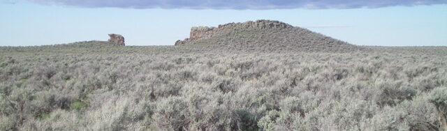 From the corral, follow the 2-track road to its end on the left-hand side of a fenced area that has two water tanks. Scramble south-southwest directly up a slope of easy, short field grass in sandy soil. Higher up, angle south to stay left/east of a dry gully. Reach a flattish area with scattered boulders. From here, the summit hump/block is finally visible to the right/west. Scramble directly at the summit through tall sagebrush. Drop 15 feet to cross a minor dry gully and scramble up to the base of the rocky summit cap/ridge. Climb up the face of the summit block and carefully walk along its top to reach the high point. There are some triangulation posts on the ground to the right/east of the high point. There is a crater of sorts to the left/west of the summit ridge crest and the dropoff is material so don’t lose your footing here. There is no clear reason to call this peak Table Butte as there is no obvious flat area and the summit is the antithesis of a table.