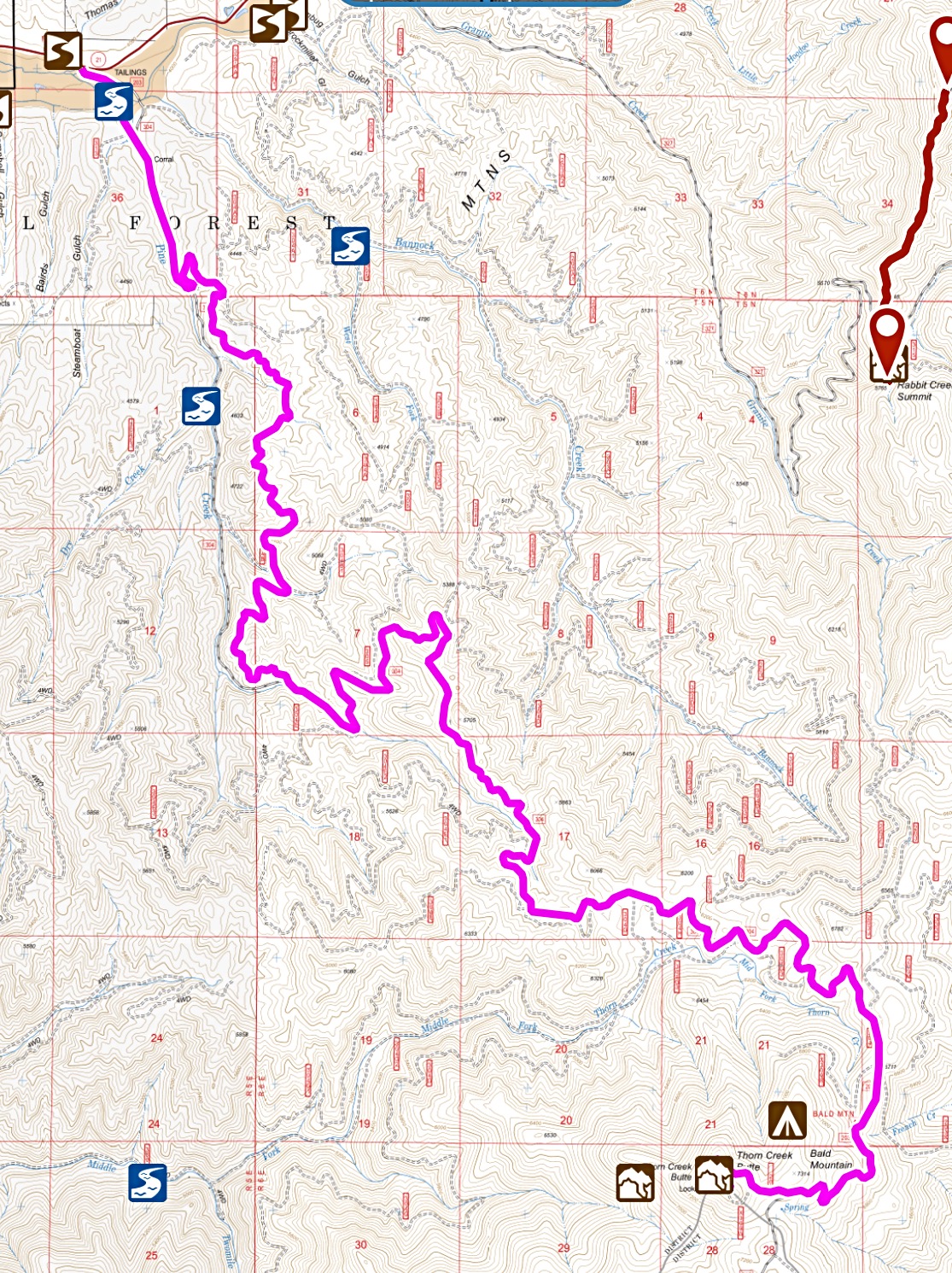 This road is accessed from ID-21 just east of Idaho City. The turn is signed for Thorn Creek Butte. Turn south and quickly cross a bridge over Mores Creek. After the bridge, the road then weaves through a flat area used by campers and reaches a junction. Stay left at the junction which is signed as FS-304. It is 14.3 miles to the summit from the highway. At 12.3 miles, FS-304 becomes FS-203. Shortly after this number change, the road reaches Bald Campground which has a pit toilet and 4 campsites. The road to this point is narrow but, with the exception of one rutted spot, is passable for most vehicles if driven slowly and carefully. The road deteriorates after the campground. Therefore, traveling the remaining distance on foot is recommended. Otherwise, a 4WD vehicle is advised.