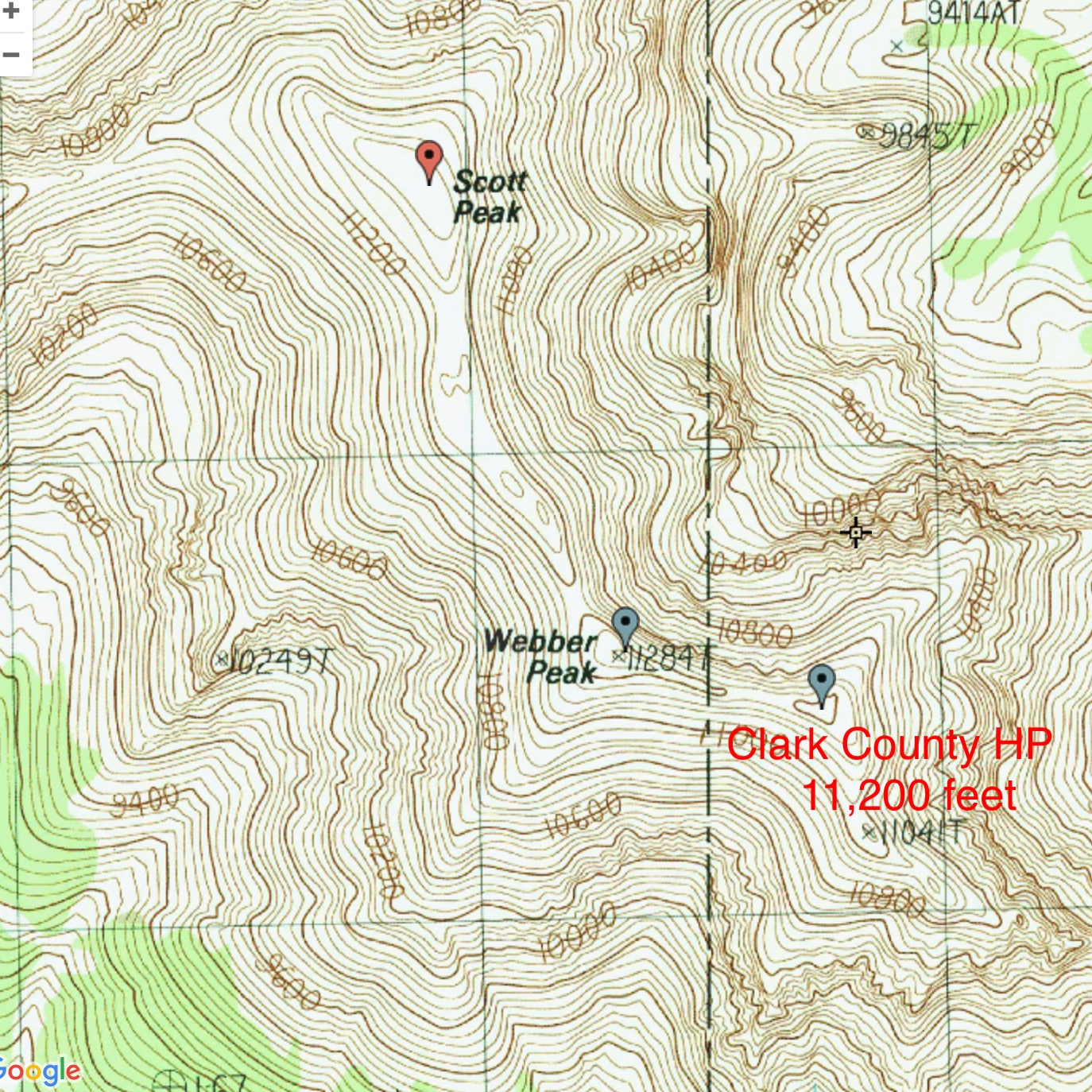 As noted in the book, Webber Peak is not a separate peak but is the [lower] South Summit of Scott Peak. It has only 104 feet of prominence. To complicate matters, the highest point in Clark County is located just southeast of Webber Peak. The high point’s elevation is 11,220 feet and there is only 40 feet of rise from the Webber/Clark County HP saddle. USGS Scott Peak
