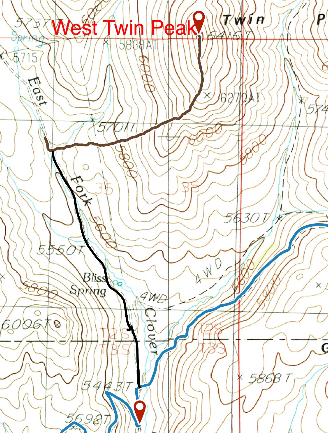 West Twin Peak is located due west of East Twin Peak on the Bennett Mountain Hills Crest. Like its twin, it can be climbed from almost any direction. USGS Fir Grove Mountain
