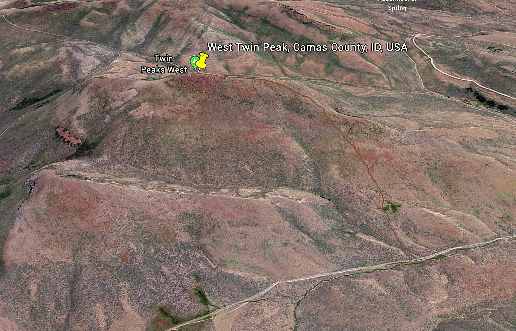 Road access to the peak’s south slopes is via the Davis Mountain Road. This road is discussed in detail on the Bennett Mountain Hills page. Starting on ID-46, take the Gooding City of Rocks Road to the signed Davis Mountain Road. Follow this road west for 8 rough miles to the East Fork Clover Creek. 4WD recommended. Just after you cross the creek, a two-track heads up the drainage. Follow this road to the 5,600 foot contour.