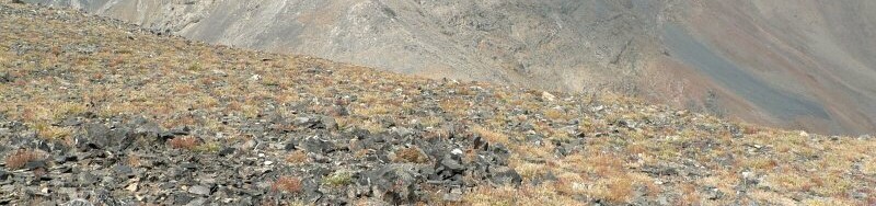 The north ridge begins at the 10,820-foot ridge saddle between Wet Peak and Hidden Peak, approximately 1/2 mile north of Wet Peak. Scramble up the narrow ridge crest to the gentle, broken-scree summit of Wet Peak. The high point is at the NW end of the slanted, elongated, ridge line summit area. It is NOT located at the [lower] Wet Benchmark shown on the Mackay quadrangle, which is approximately 200 feet to the SE. There are two USGS benchmarks embedded in large ground boulders at the Wet Benchmark location. There was no summit cairn on either the true summit or the Wet Benchmark, so I built a small cairn atop the true summit.
