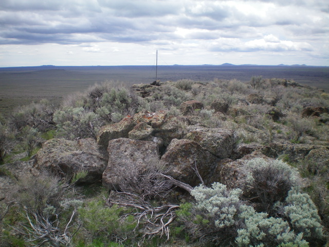 From the road junction, bushwhack west through gapped sagebrush to the summit, which is located at the right/north end of an elongated summit ridge. The official summit has a pole on top and triangulation posts nearby but a rocky outcrop just to its north has a torn-down cairn and appears to be slightly higher. I could not locate a USGS benchmark on the summit.