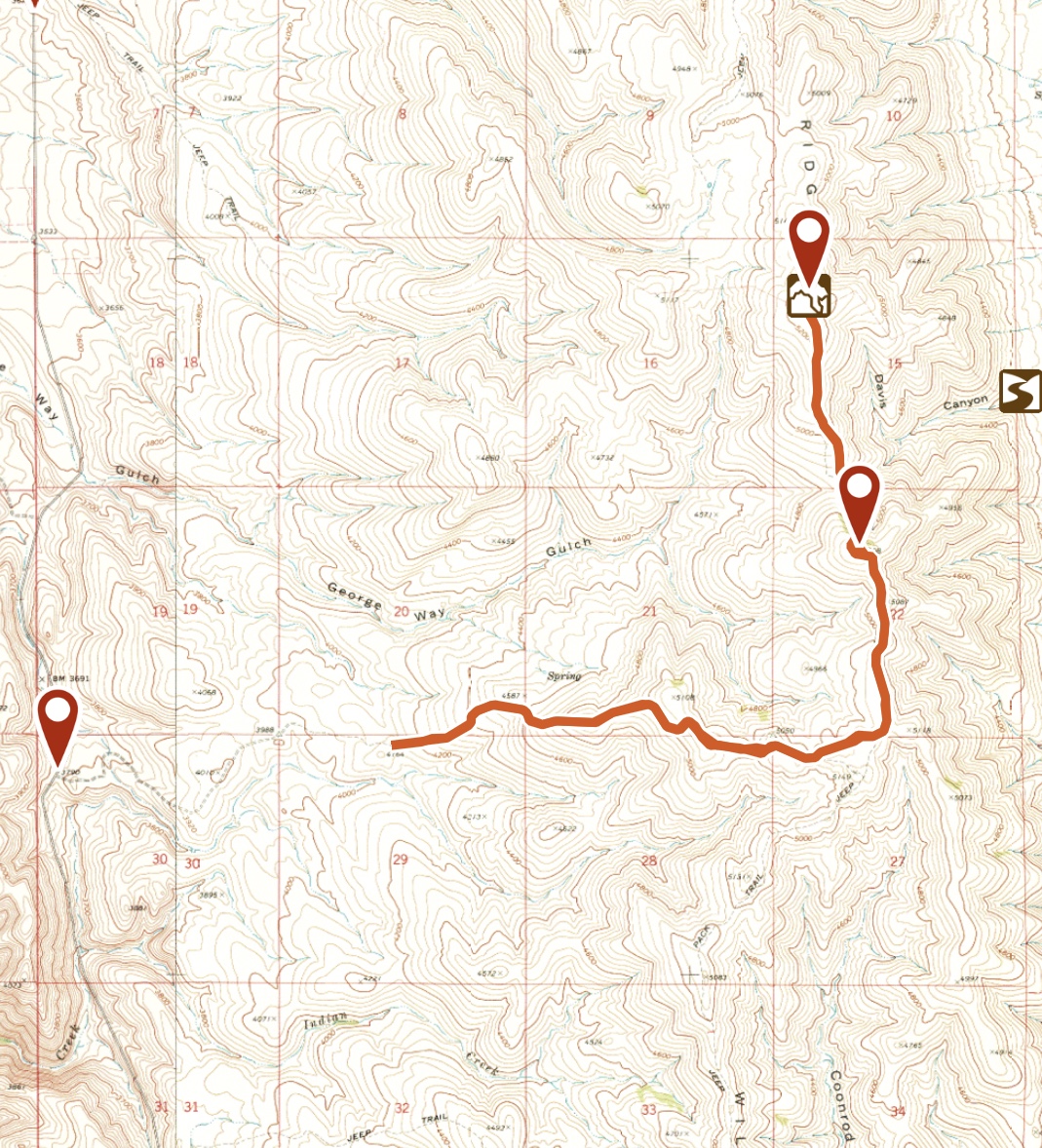 After 5.8 miles, the road reaches a pass which is signed designating the Payette-Washington County line. Continue another 1.7 miles to another pass where a 4WD road leads to the east. This road starts out as a 2-track road but eventually deteriorates into a difficult 4WD route better suited for hiking. It quickly crosses a rugged, washed-out irrigation ditch before proceeding up ridge that climbs east toward the Willow Ridge Crest. Your vehicle and driving skills (courage) will dictate how far you drive.