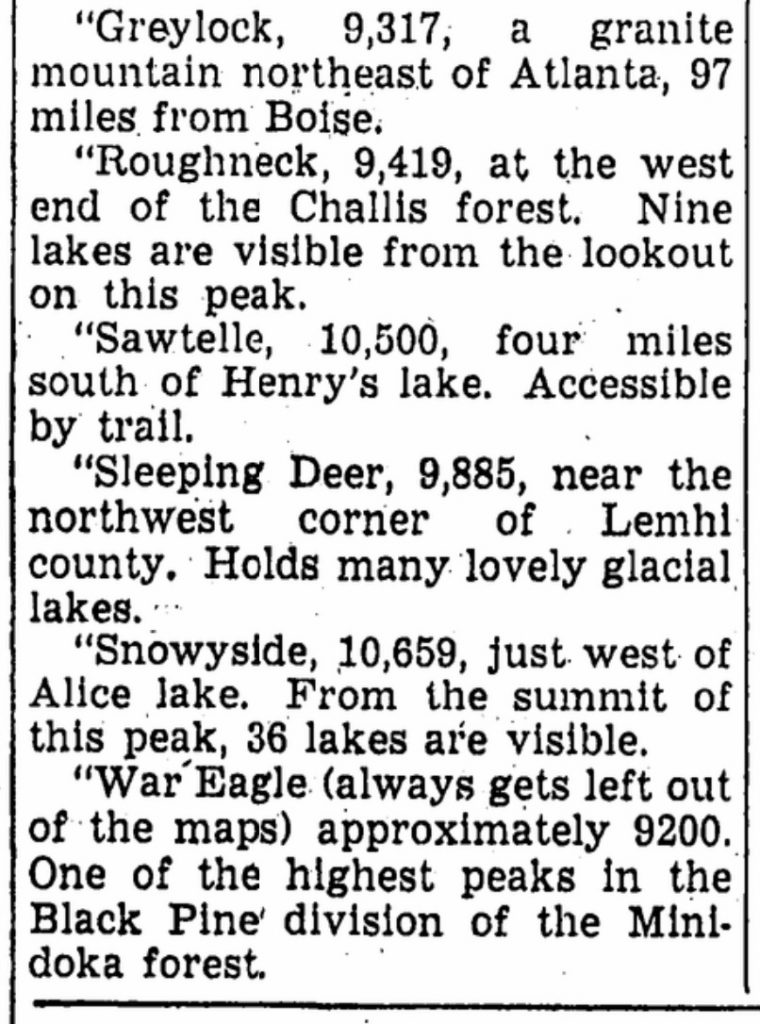 When I wrote Idaho: A Climbing Guide, I noted at the time the second edition was published that “The following [Climbing History] is a thumbnail sketch of Idaho’s mountaineering history, filled with unfortunate, but unavoidable gaps.” In the intervening years, I have searched for additional accounts of Idaho climbers to fill in the gaps. I recently came across a couple of 92-year-old Idaho Statesman articles that answered one of my unanswered questions about the Sawtooth Range.
