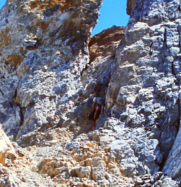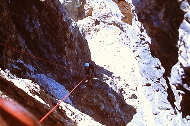 On our third trip at the beginning of July, 1975 we altered our plans once again. Instead of camping at the base and climbing the gully, we decided to haul all of our gear up to the bivy ledge both saving us time and avoiding any more encounters with our buddy, the bear. We couldn’t convince Guy to go back again so we recruited Mike’s cousin Sam to join us on our adventure. Carl was still interested so as a foursome we headed back up to Grandjean for the long grind up the Payette River. After a long day on the trail and a hard climb up the gully, we made it to our bivy spot below our climb.