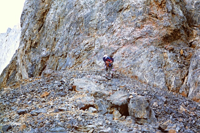 As soon as I got home from our pack trip, I started talking up with my climbing friends what I had seen on the Payette River. It didn’t take long to generate interest in Kong, and we made the trip in early October. This time we didn’t have horses, which meant our backs and legs took the load on the grueling hike above Fern Falls. After a hard day on the trail, we found a nice camping spot below our objective and spent the night. The next day we started looking for a way to get up the rock to the bottom of a massive slab that marked the beginning of final peak. There was an obvious gulley along the left of the climb but it was very steep, loose, and it looked like a death trap loaded with boulders that could tumble in a heartbeat. We found a fourth-class zigzagging rock route that led to a nice ledge (for camping or bivouacking) close to the base of the slab, but it also was out of the question, because we’d be carrying full climbing packs. It was getting late and we knew we’d have to do more exploring to figure out this challenge. We descended and decided to come back early the next summer, when the gulley would most likely be filled with snow.