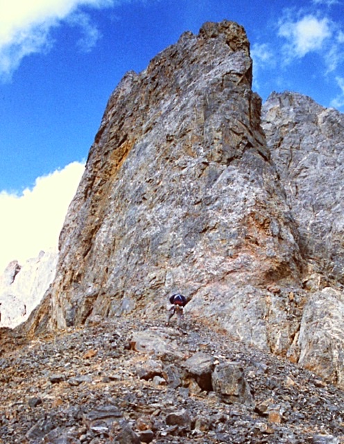 Typically for fall, the weather improved by evening and the next day promised to be much better. The morning was clear and cold but by afternoon it had warmed into the lows seventies , and the dusting of snow had all but melted. The Carson kids, Bruce, Jackie, and Guy, headed up Tenlake Trail with me, and after about a half-mile we spotted a worthy climbing objective: the eastern face of Point 8590.