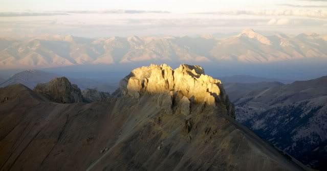 Not wanting to leave without some kind of summit, we decided to explore the top of the ridge and try to find the finish of our future climb. We were carrying only day packs, so we climbed up the gulley and along the ridge, where we spotted some interesting formations. There was a beautiful tower at the top of the gulley and we gave it a try. Mike made it all the way up to the last thirty feet, where the rock went blank. Lacking bolts or any way to protect ourselves, we called this one a near miss. Following the ridge that separates the Payette River and the Goat Creek drainages, we spotted a summit that looked reasonable and got to the top of it.