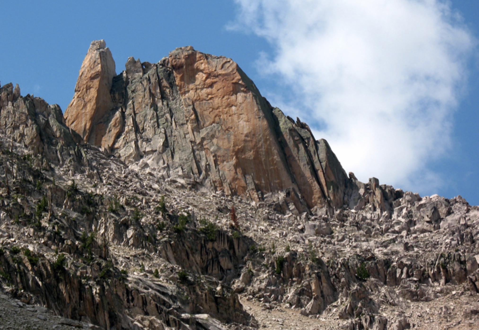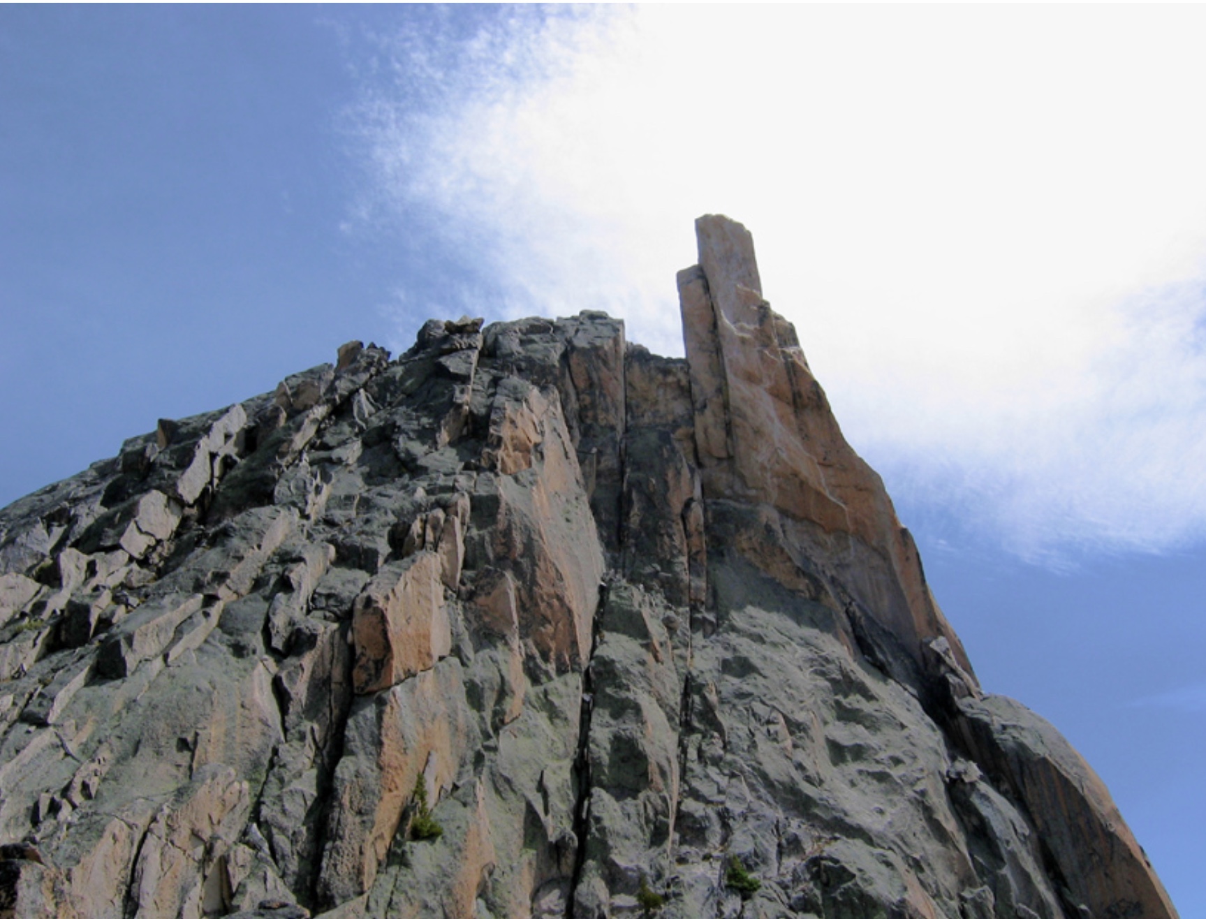 By the time the four of us down-climbed to our bivy ledge the sun was starting to set. We ate and settled into our respective spots. Soon it got dark and the wind began to blow in earnest. We saw the first of many flashes as a thunderstorm rolled in from the west. Rain poured down and the wind whipped up to about 50 m.p.h. We huddled in our spots and, in case we took a hit, we said goodbye to each other over the howling wind. Lightning struck below and above us. Rain hit the rocks in sheets and for maybe ten minutes it went up the mountain instead of down it. It then changed direction and poured downward for at least another half-hour. Lightning flashes that illuminated the entire mountainside left us temporarily blinded. There was no pause between the lightning and thunder, only loud explosions and an acrid smell in the air. Finally, the storm passed, and we were all okay. I later realized we had gone through a vertical wind shear, where the wind blows up one side of a thundercloud and down the other. We had experienced both sides of the storm.