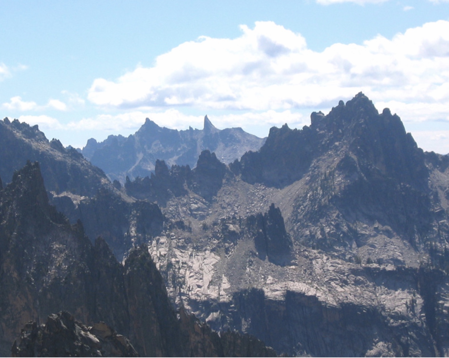It was getting late in the afternoon so we went back to camp, our plans for the next day now set. After a big breakfast along with real cowboy coffee, in which the grounds are dumped right into the water and boiled over an open campfire, the four of us headed back up Tenlake Trail, this time loaded with rock-climbing gear and a rope. We found a series of ledges that started out as second class but turned to fourth class higher up the face. At that point, Jackie decided she had had enough rock-climbing and went back down. Bruce, Guy, and I continued up until we finally reached a point where a rope and belay were in order. I led the first pitch, a delightful 5.4 (of a maximum 5.15 class rating) on near-perfect granite. After I brought Bruce and Guy up, we stayed roped and finished with another pitch of fun climbing. Below the top it turned to easier ground where we could scramble to the high point on the ridge and soak in views of the central Sawtooth Range.
