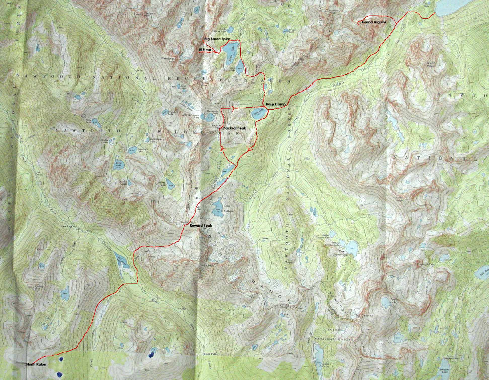 When the time came in June 1974, we decided to do things a little differently. Instead of hiking up the South Fork of the Payette River and arriving in the heat of the afternoon, we would spent a night at the Grandjean campground and depart at 1:00 a.m., which should put us at our base camp early in the morning. Everything went as expected and we arrived in time for breakfast and a good rest. We lounged around for most of the day, enjoying the scenery and exploring the Elk Lake area.
