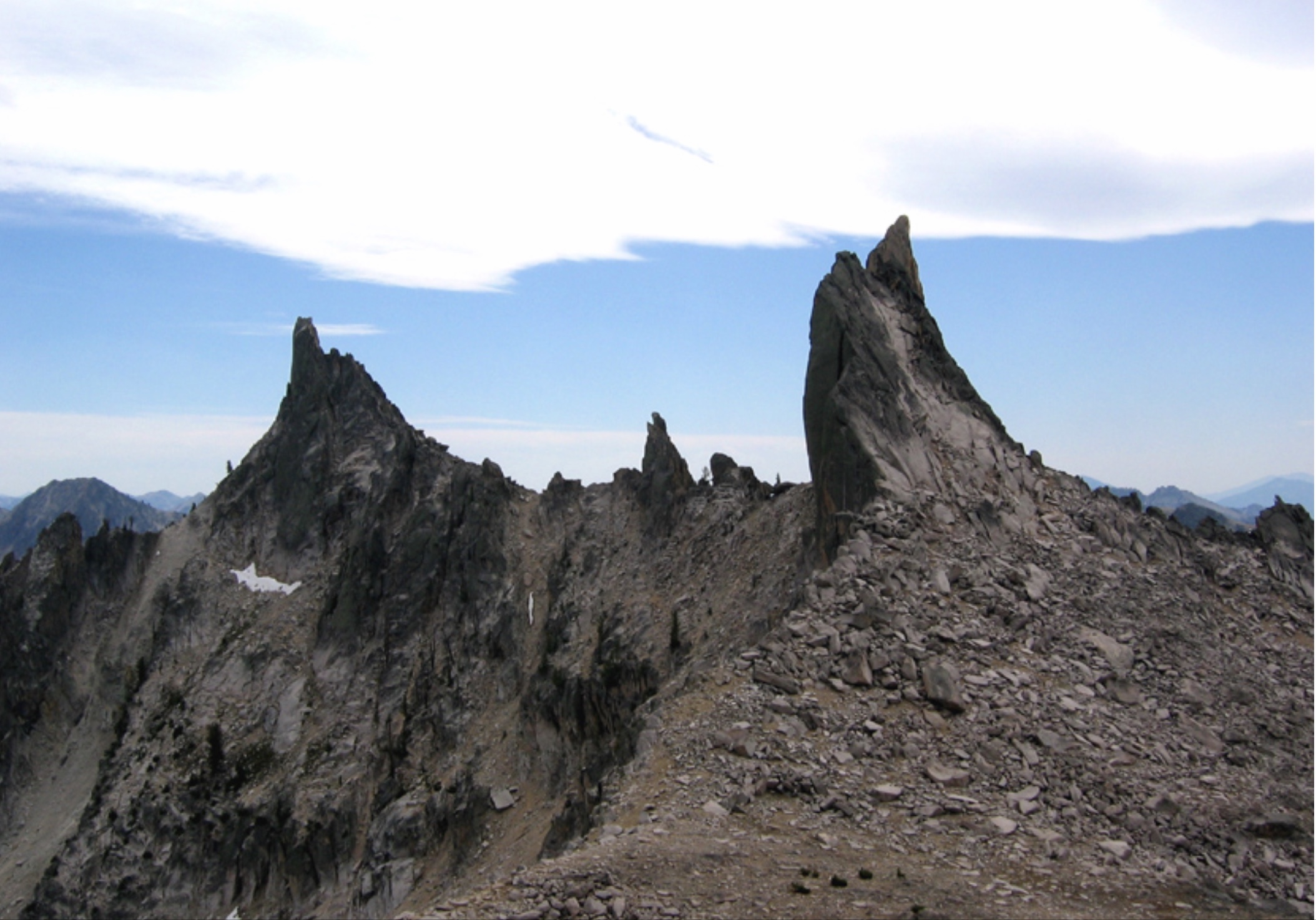 Not wanting to leave without some kind of summit, we decided to explore the top of the ridge and try to find the finish of our future climb. We were carrying only day packs, so we climbed up the gulley and along the ridge, where we spotted some interesting formations. There was a beautiful tower at the top of the gulley and we gave it a try. Mike made it all the way up to the last thirty feet, where the rock went blank. Lacking bolts or any way to protect ourselves, we called this one a near miss. Following the ridge that separates the Payette River and the Goat Creek drainages, we spotted a summit that looked reasonable and got to the top of it.
