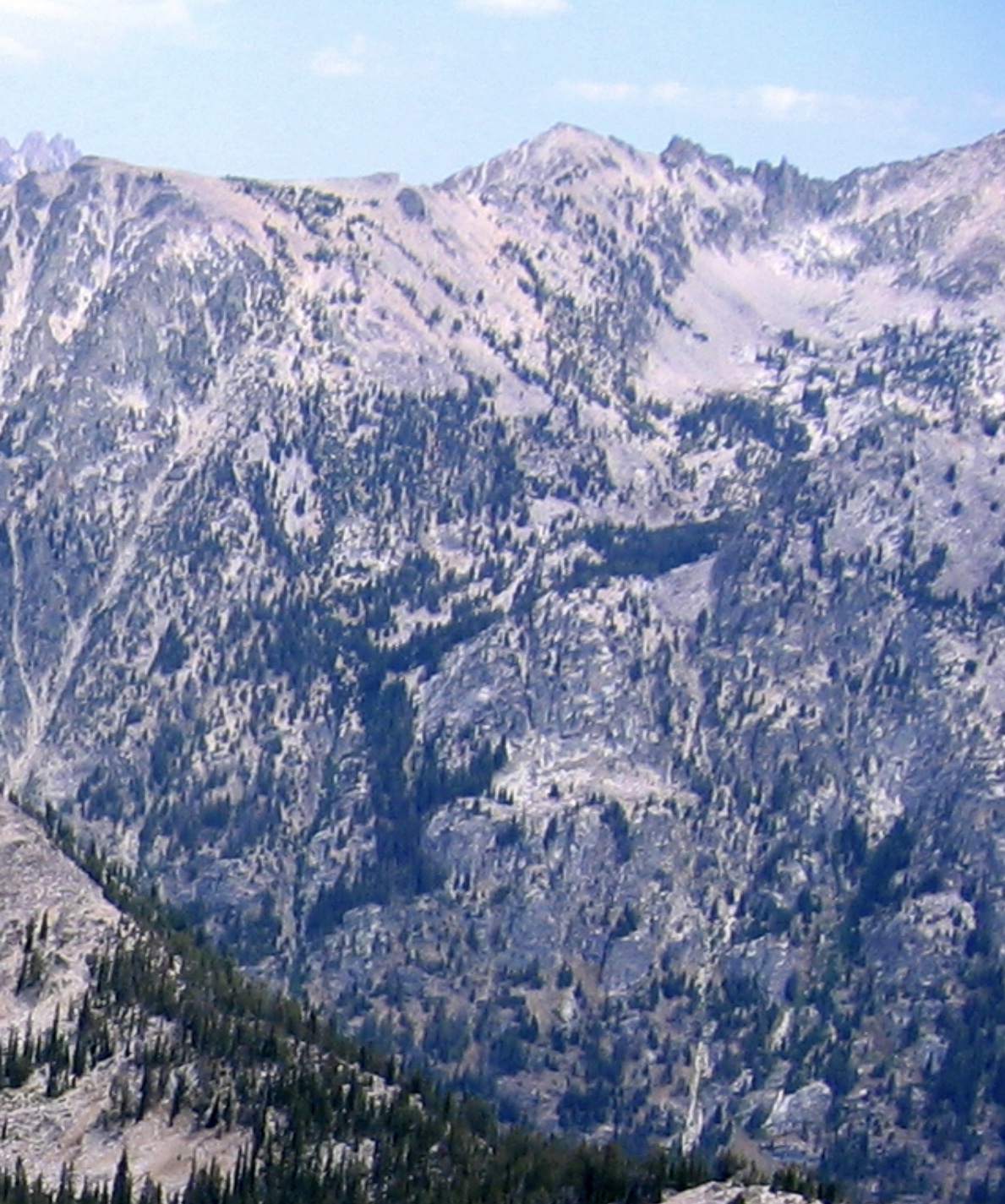 Typically for fall, the weather improved by evening and the next day promised to be much better. The morning was clear and cold but by afternoon it had warmed into the lows seventies , and the dusting of snow had all but melted. The Carson kids, Bruce, Jackie, and Guy, headed up Tenlake Trail with me, and after about a half-mile we spotted a worthy climbing objective: the eastern face of Point 8590.