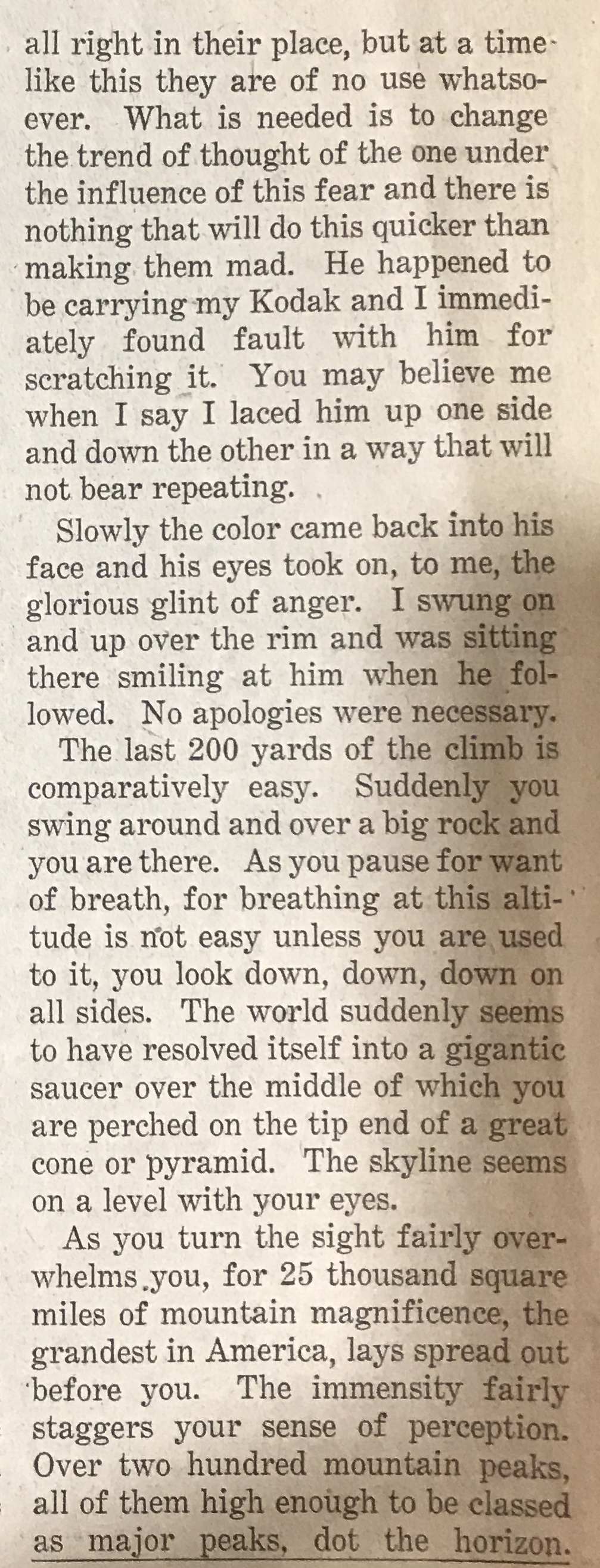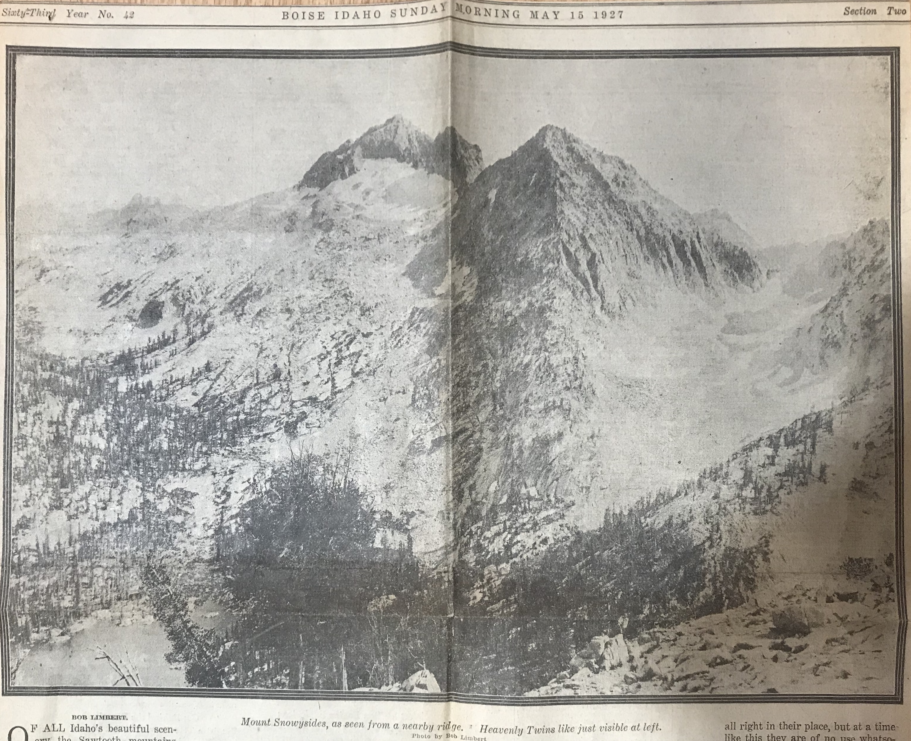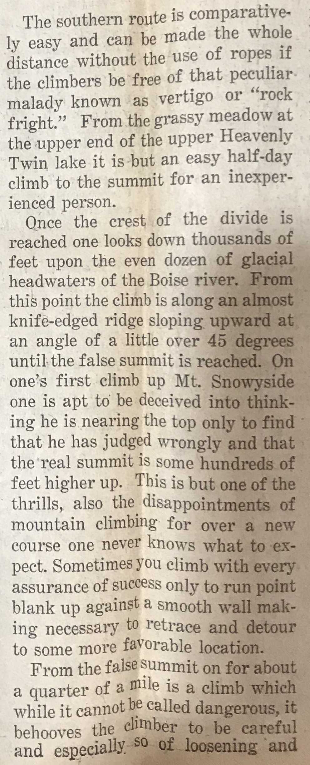 Williams, with Area Scout Executive Amby Frederick, were the first of the Twin Falls group to reach the summit, making the ascent in 4 hours and 35 minutes. Both agreed the climb is not quite as interesting as that up Mount Hyndman, long thought to be the top in Idaho elevations, but agreed the badly crumbling rock on Mount Borah is more dangerous. Part of the way one must travel a narrow, razor-like hogback, part of which is so narrow that a false step might mean a fatal slide down a 45-degree slope under tons of avalanching shale.