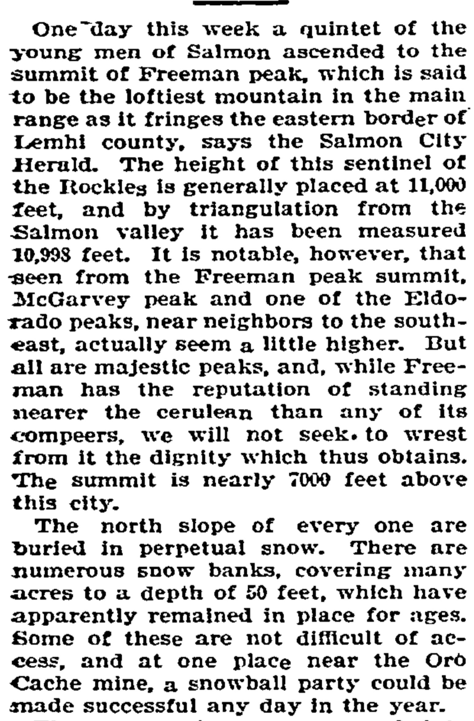 HAILEY — Norman Clyde, who makes a specialty of guiding parties on mountain climbs, is in the Sawtooth country looking for new territory and has finished climbing a number of the major Sawtooth peaks, including some of the White Cloud peaks and Castle Peak. He reports that Castle Peak is not so hard to climb as the Grand Teton, where he conducted a party last year, but is a mountain that will appeal to mountain climbers. Mr. Clyde’s home is at Independence, California.”