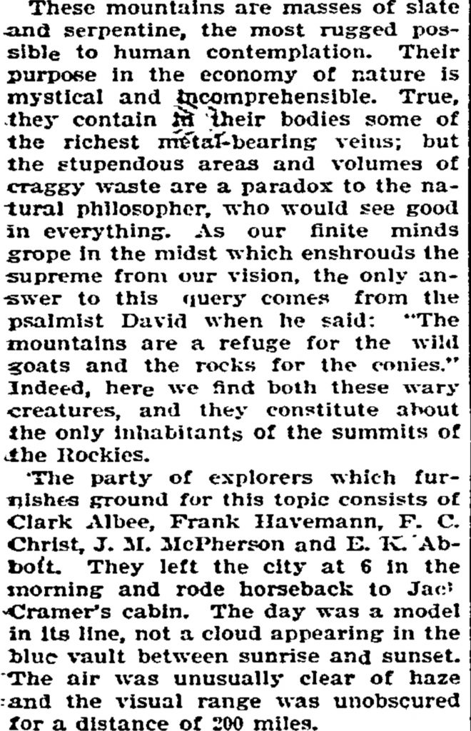“Arriving at the crest of the ridge, I came upon a trail leading toward the summit of the range. This I followed until it terminated near timber line. To the southwest, beyond rocky cirques, the summit of Mount Decker came into view. Here it was necessary to drop down several hundred feet in order to avoid an impassable crag.”