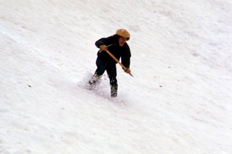 Gordon glissading “way too fast” on our way down from climbing the highest peak in the Sawtooths (June 1971).