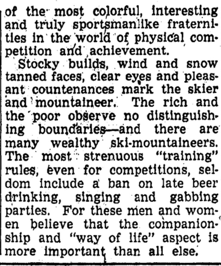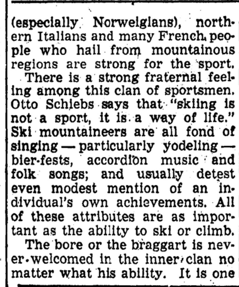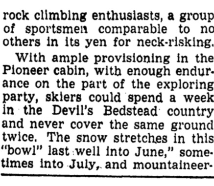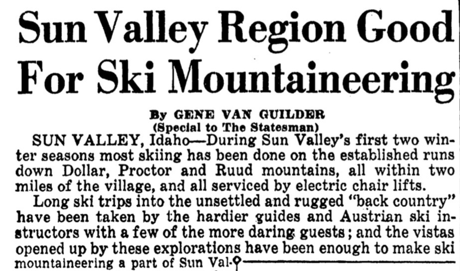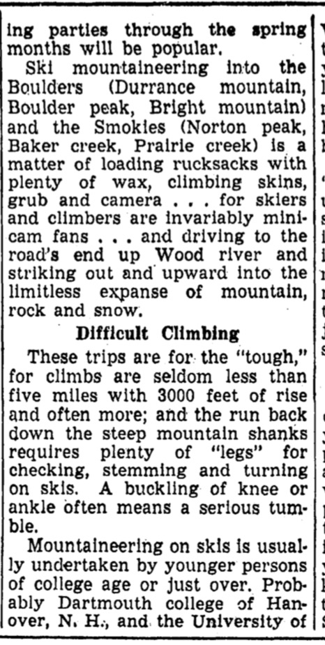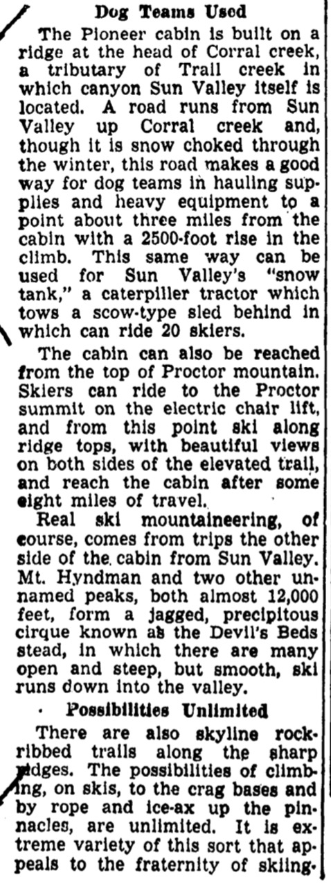 This December 4, 1938 Idaho Statesman published a Sun Valley promotional article written by the resort’s manager which discussed Ski Mountaineering opportunities in the mountains surrounding the resort. The article predates the publishing of Andy Henning’s definitive guidebook for backcountry skiing around the resort, the Sun Valley Ski Guide, in 1948. As lift skiing gained popularity and adherents, the resort abandoned Pioneer Cabin and terminated its backcountry guiding.
