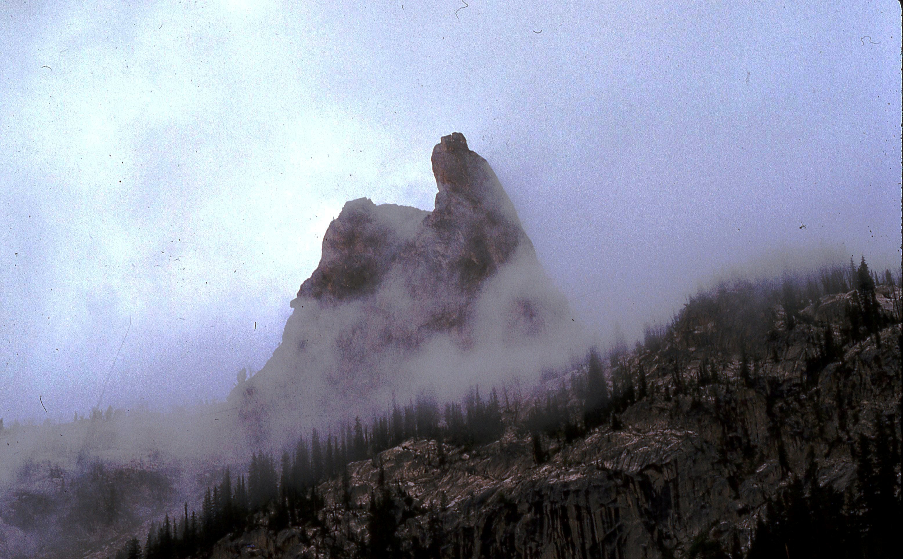 Suddenly our location near the top of a prominent pinnacle seemed imprudent. We were climbing a lightning rod. Mark and I are both afraid of lightening. We wanted to get down fast. From the ridge above the Book we had two choices.Knowing the South Side to be much shorter, we decided to rappel that way. Mark split the coil while I threw a sling over a horn on the ridge. No time to tie knots at the ends – throw the rope. More thunder and louder now we were in a panic to get off. Assemble four carabiners as a brake, clip into the line and ease gingerly to the edge. Wind was whipping rain from every direction. I would be careful not to slip on the wet rock or rap off the end of the rope.