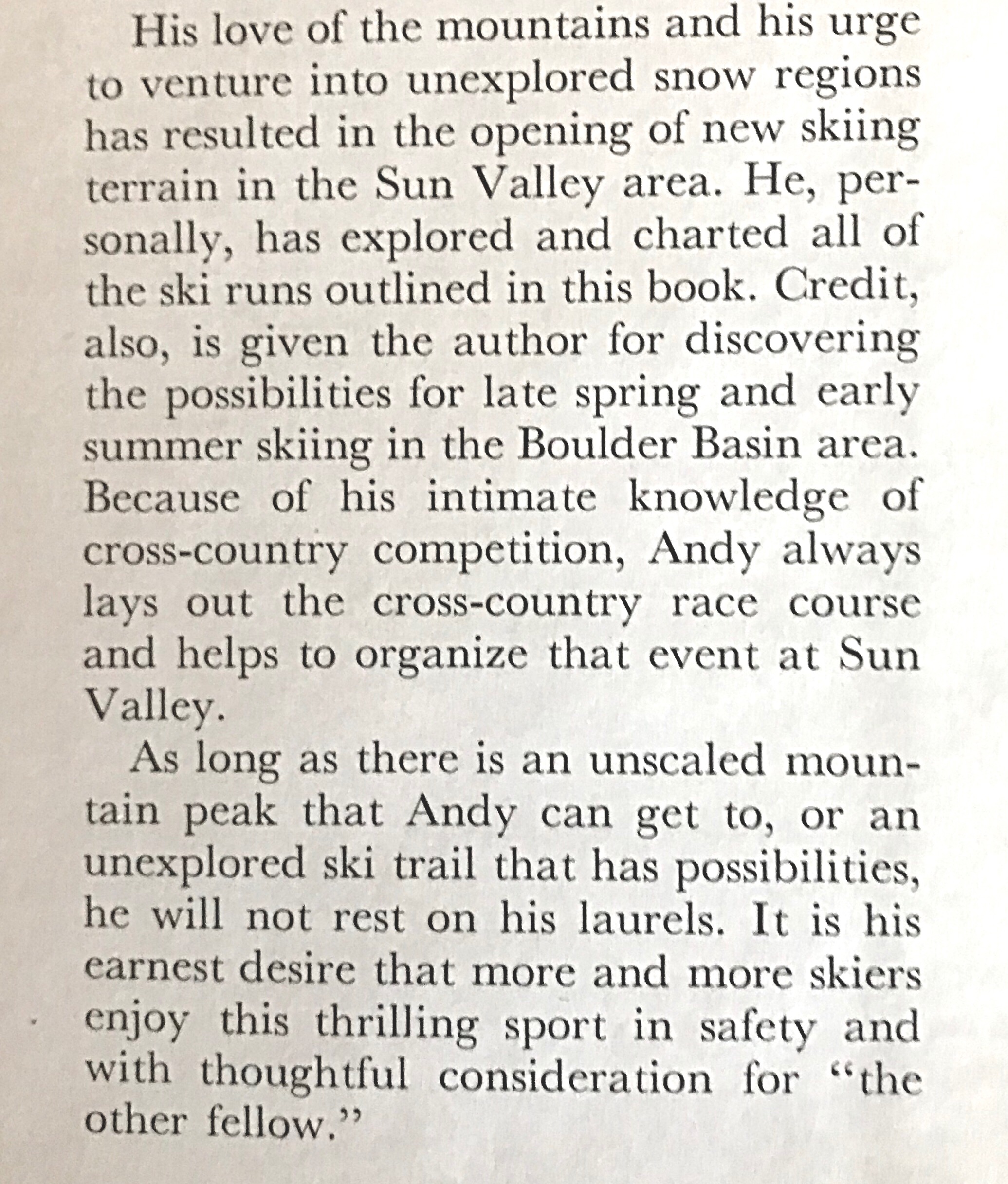 Basil Service, a friend of Henning, notes that “Henning was from Salzburg, Austria …[he] had an extraordinary love of climbing as well as skiing. To Andreas Henning, “a mountain was a gift of nature to man king, something to be admired and to be awed by.” Before he came to Sun Valley, Henning had quite a reputation as a ski mountaineer and rock climber in the Alps, with an enviable collection of first ascents to his credit. I first had a chat with Andy in 1976 when he recommended as my first Sun Valley Ski Mountaineering descent, Johnston Peak by way of Uncle John’s Gulch, in the Pioneer Mountains. After that, I was hooked. Through the 1980s and early 1990s, I skied hundreds of Andy’s routes which he generously provided to me. Andy passed away in my hometown of Pocatello, Idaho in 1993. Today, I am still skiing Andy’s ski routes.”