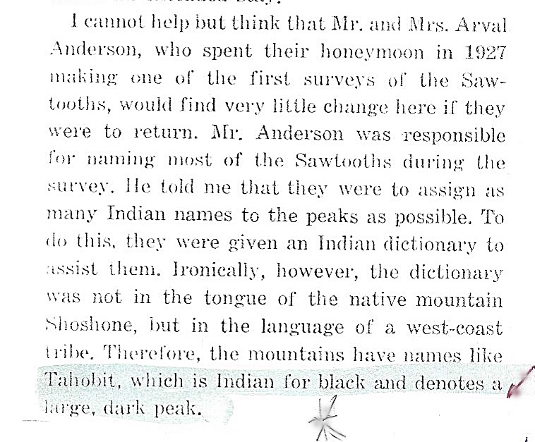 Another unique feature of this job was the fact that many of the mountain peaks, streams, and lakes in our area were not named. I was, therefore, instructed to name those that I believed warranted naming. I was not allowed to name them after any of our party or other people unless there was a bona fide reason. I was provided with a dictionary of American Indian words to apply in order to help perpetuate such words. We first adopted names that had local usage. This meant little. as nobody lived in the area I mapped. Much of it is now in the Sawtooth wilderness area. We named many of the peaks. streams. and a few lakes. There were more than a hundred lakes, but most of them were too small to warrant a name at that time.