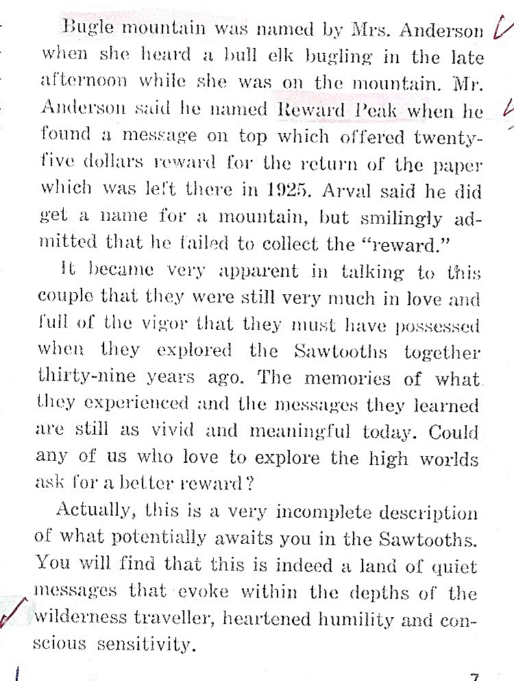 Reward Peak was so named because on the top they found a pile of stones with a paper under it. The paper said “There is a $25 reward for whoever returns this paper to: ” Then there was an address. Grandpa wrote to them, but they never wrote back.
