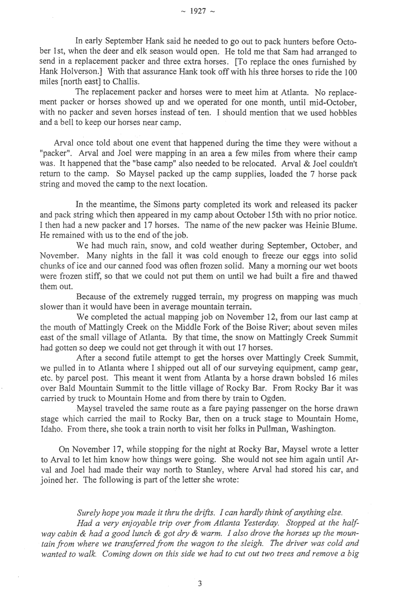 Now to get back to our efforts to leave the area: After a second futile attempt to get the horses over Mattingly Creek Summit. we pulled in to Atlanta where I shipped out all of our surveying equipment. camp gear, etc. by parcel post. This meant it went from Atlanta by a horse drawn bobsled 16 miles over Bald Mountain Sumit to the little village of Rocky Bar. From Rock Bar it was carried by truck to Mountain Home and from there by train to Ogden. Maysel traveled the same route as a fare paying passenger on the horse drawn stage which carried the mail to Rocky Bar. then on a truck stage to Mountain Home. Idaho. From there. she took a train north to visit her folks in Pullman, Washington. The packer leading all his horses took the same route to Rocky Bar, but then went through Fairfield and Bailey to Challis; a trip of about 200 miles.