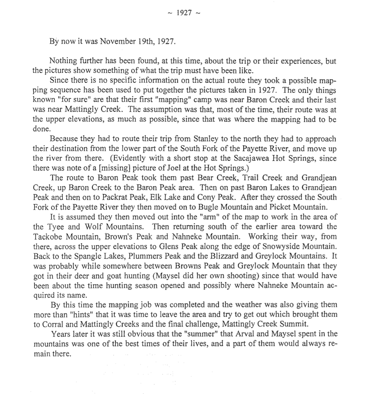 During 1927 Arval, Maysel and Arval’s brother Joel lived and worked in the Sawtooth Wilderness creating a map. A copy of that map is enclosed. He occupied most of the major peaks and named many of the peaks, streams and rivers.