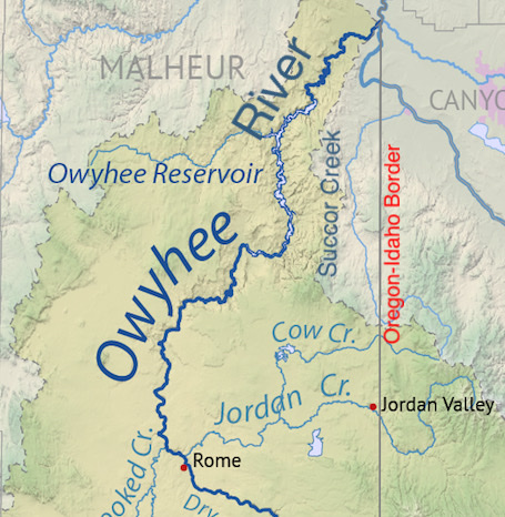 The Owyhee River flows for 280 miles from its headwaters in northern Nevada to reach its merger with the Snake River. A significant stretch of its course cuts through the Oregon Owyhee Mountains, cutting a deep canyon which divides the range into eastern and western sections. The river enters the 52-mile long Owyhee Reservoir in its northern reaches.