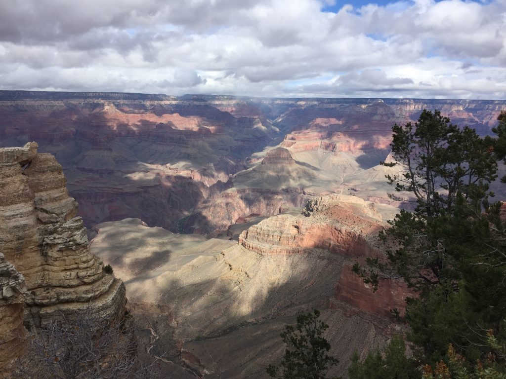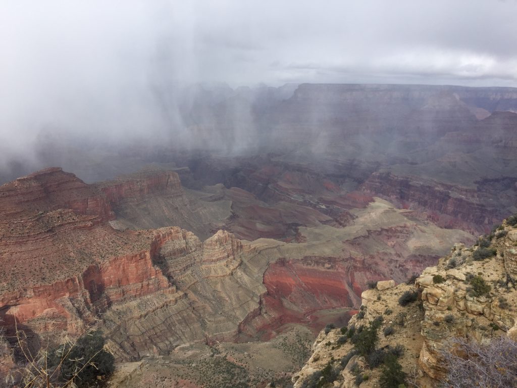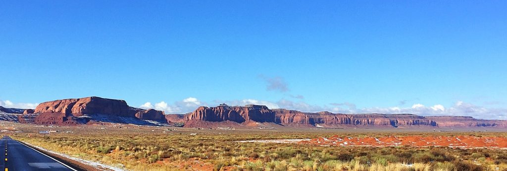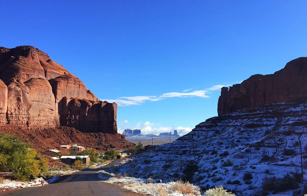 From Sedona, we started our drive to Moab on a snowy morning, especially around Flagstaff. With improving weather, we decided to detour to the Grand Canyon’s South Rim. After a lunch break, the snow settled in and soon covered the roads. The motorhome handles snowy roads much better than you would expect. But we still had a lot of “white knuckle” driving ahead of us. We drove in these poor conditions to the Blanding Trading Post on the Navajo Reservation where we secured a spot in the RV Park.