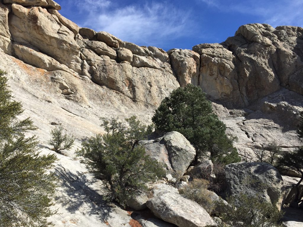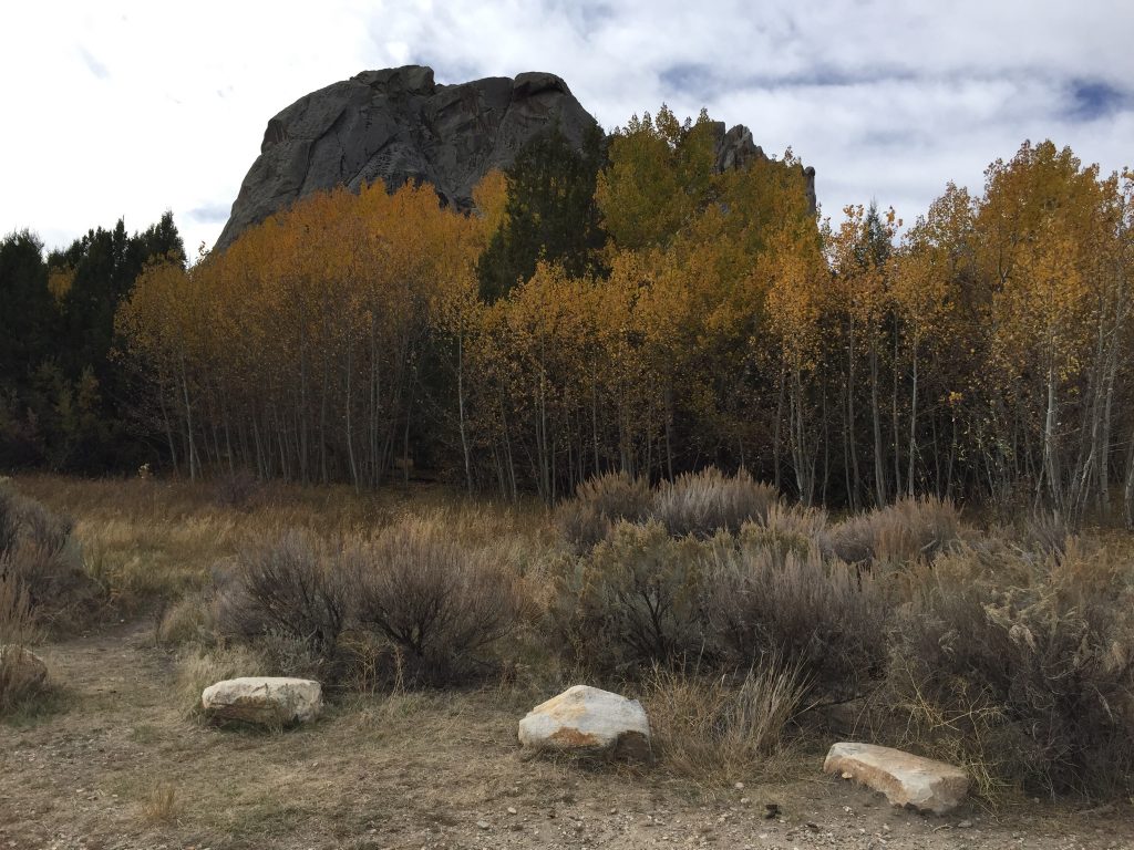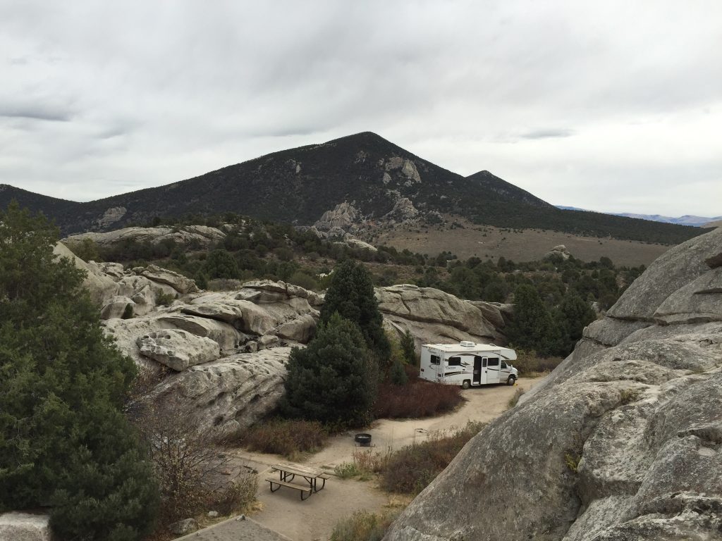 It was a cloudy day which made for great lighting on the peaks. Mount Harrison is a beautiful peak with a paved road to the summit. There are lots of self-propelled ways to reach the summit. Conner Ridge is a peak composed of a big sweeping ridge above the Pomerelle Ski Area. We have a nice campsite (#11) at the City of Rocks though the site is not level. We are nearly surrounded by granite.