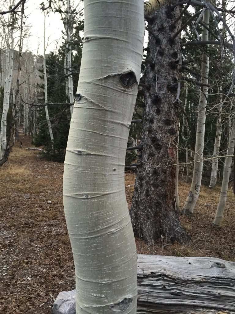 October 28. We got up early. Laurie made my breakfast. We drove the short distance to the trailhead and I started hiking at 7:15AM. It was overcast and cool with a breeze but still great hiking conditions. Reached the summit of Bald Mountain about 1-1/2 hours later. The last 300 feet were cold and windy but the sun came out briefly. I continued on to Buck Mountain over easy terrain in another 40 minutes. Great views of Wheeler Peak all the way. I made a quick descent down to the road through a beautiful aspen forest. Total hiking time was 3 hours. A special hike by any measure.