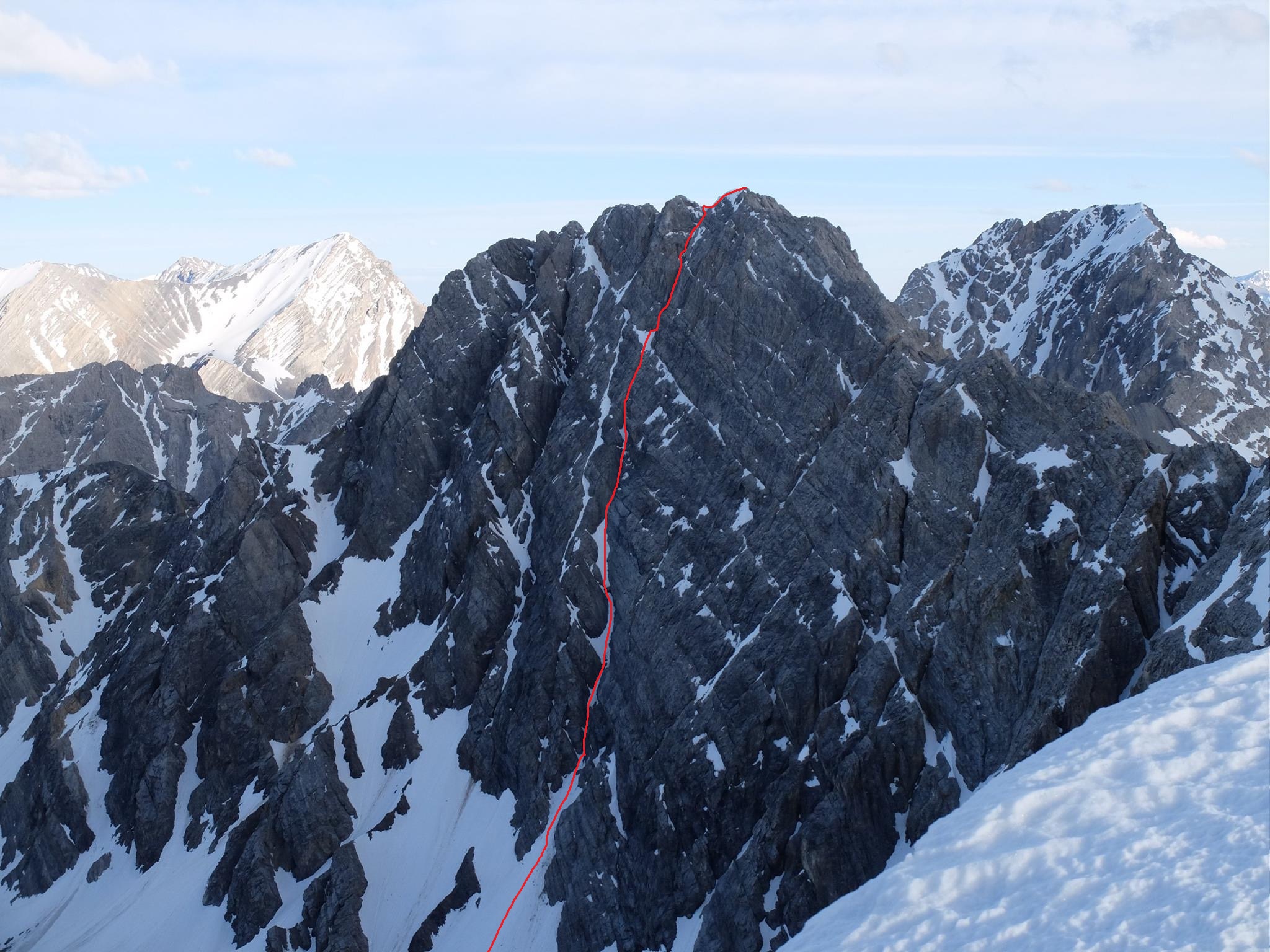 Pitch 7 (30 meters): Steep snow to the top, then a stones throw to the summit. Well protected.