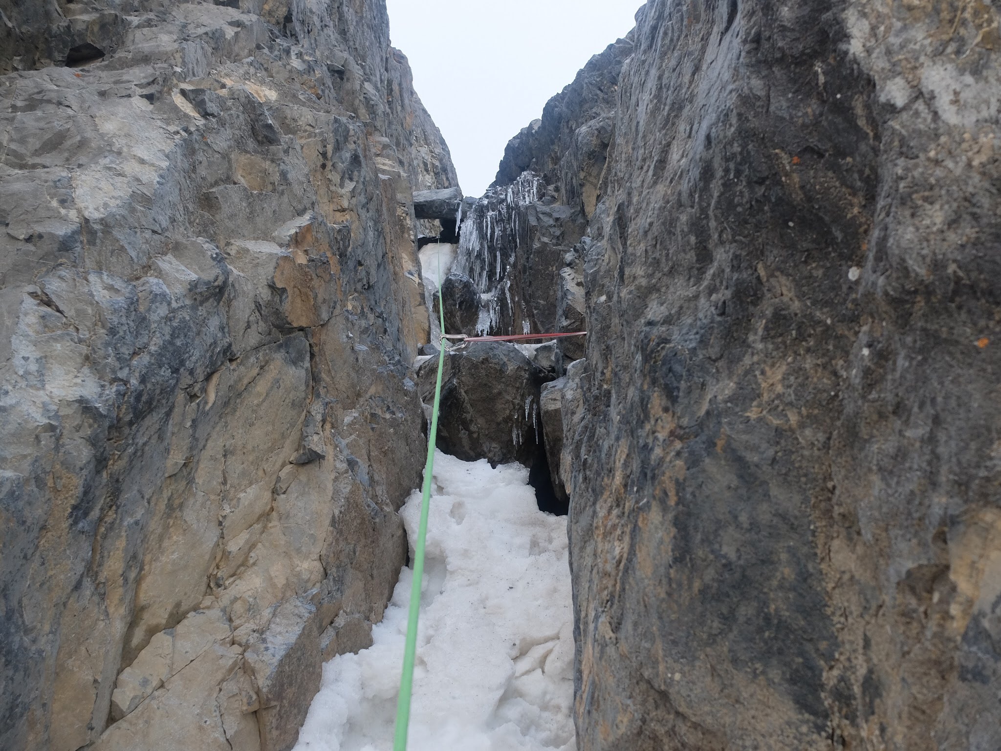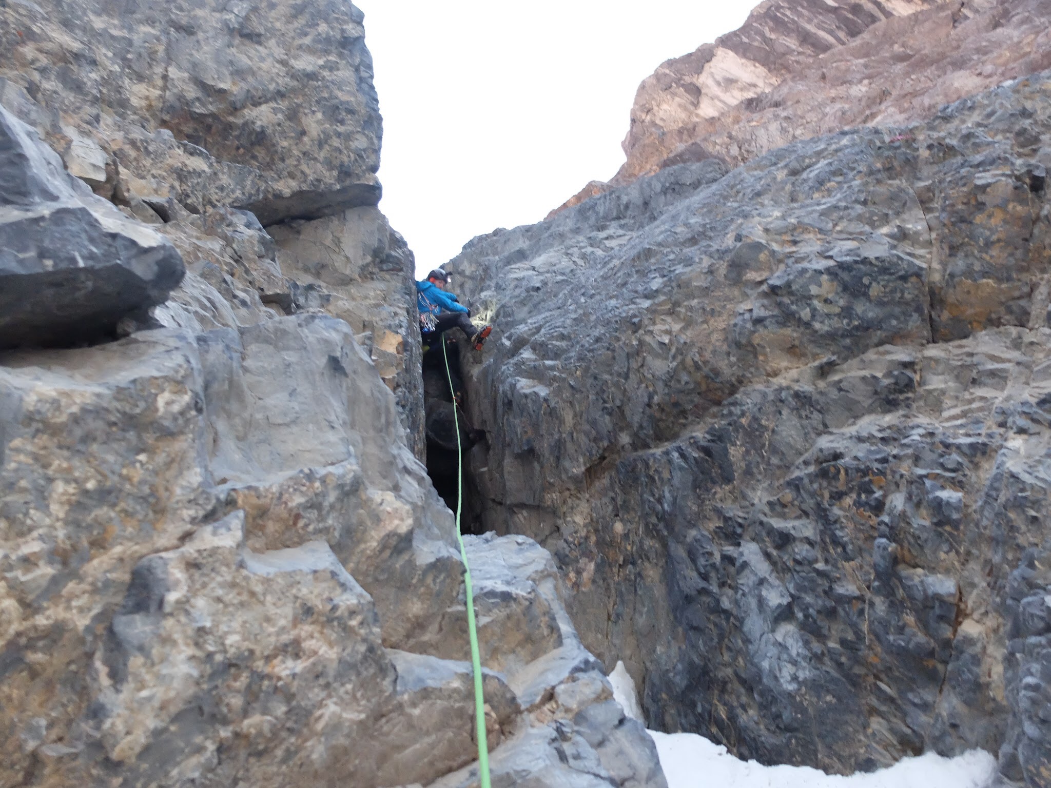 Pitch 6 (50 meters): Steep, narrow ice chimney under a chockstone followed by a little face climbing to get around another large chockstone. Anchors were found about 15 meters up the steep snow after the technical climbing ended. This pitch was hard and awkward. There were good stances available to put in some deep ice screws, so we’re tentatively calling it WI 4 rather than WI5+, which is how we felt immediately after climbing it. WI 4 or 5, M3.