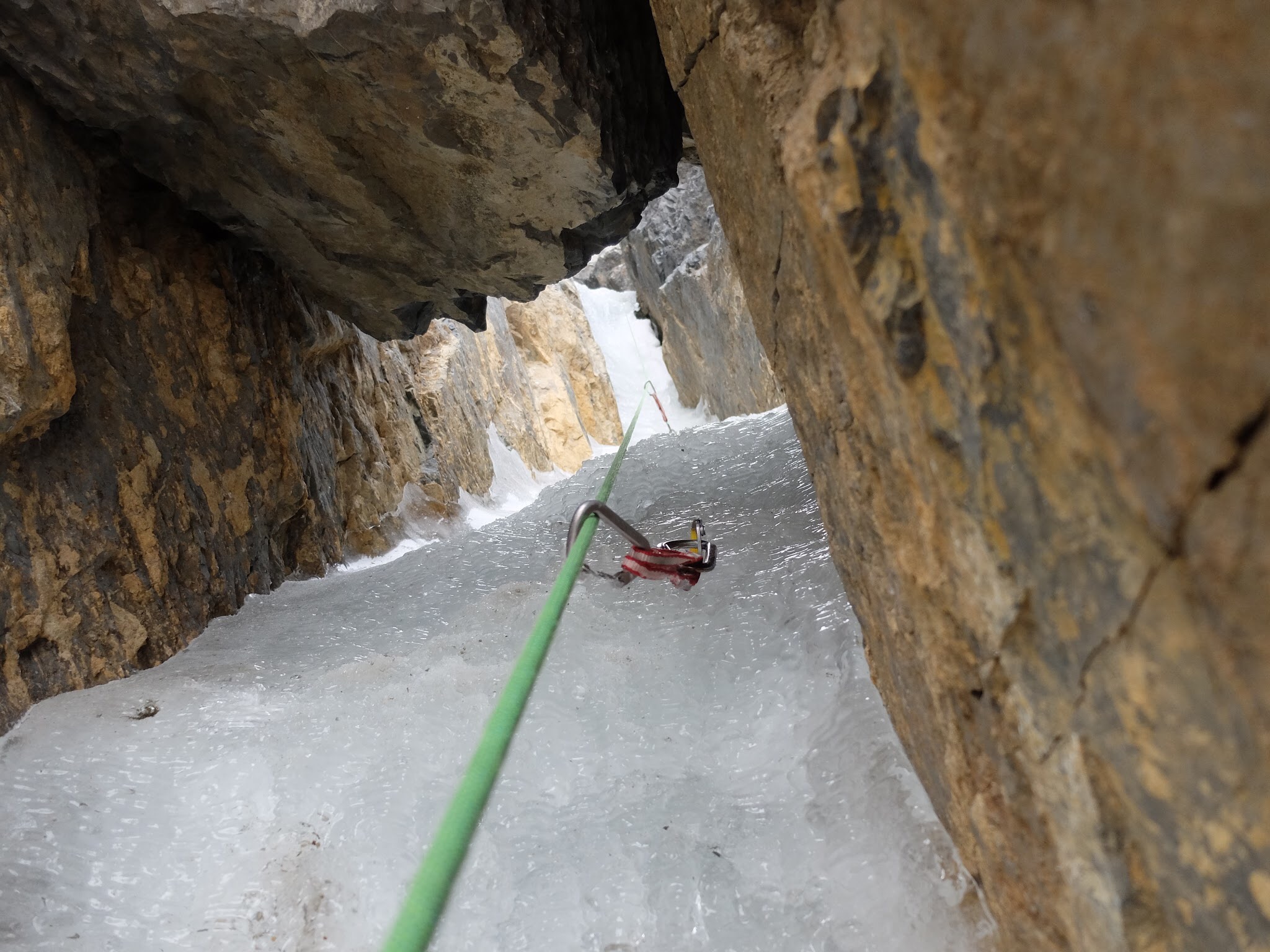 Pitch 3 (70 meters): Narrow ice chimney under and over various chockstones. WI 3 or 4.