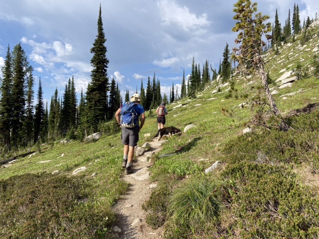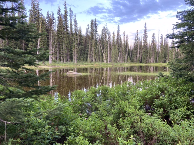 We reached Swamp Lake. Steve pointed out the lake’s name was consistent with Idaho naming protocols. In other words, the lake was misnamed. There was nothing “swampy” about the lake. Swamp Lake sits at the interface between the northern forest and alpine terrain above. It is a beautiful spot where one might be tempted to sit and enjoy the blossoming morning. Cognizant of the 30 percent chance of thunderstorms we resisted the temptation and continued on as the trail climbed up the headwall, switchbacking toward the pass still another 900 feet of elevation above us.