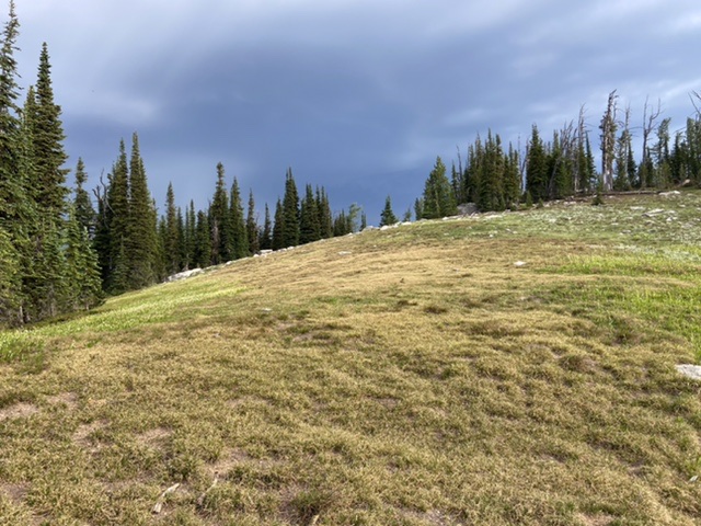 As we neared the pass, Alex said “that’s thunder.” No, I thought, “it’s too early.” I looked at the sky. An edge of darkness met the morning’s bright sunshine on a line punctuated by the ridgeline. The thought that long drive and the swampy mosquito infested night might have been in vain entered my mind. You just cannot safely cross exposed ridges when lightning threatens. Nevertheless, we had no intention of turning around. After a short discussion, we decided to continue to the partially forested Friday Pass.