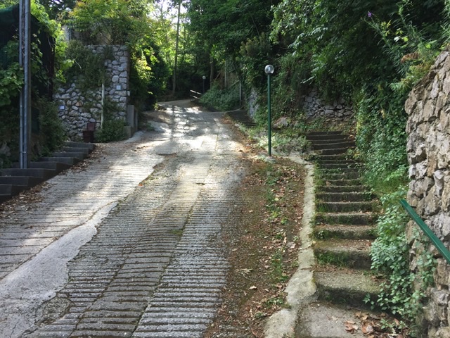 Monte Solaro (1,919 feet) is the highest and most panoramic point on the Isle of Capri. On a clear day, the view is amazing–stretching from the center of Capri to the Sorrento Peninsula on the mainland to the Galli Islands and the Gulf of Naples. While there is a restaurant on the summit (accessible via a chairlift), the trail to the top is an outstanding hike. The route begins in Upper Capri at the Via Axel Munthe. I turned onto the Via Salita and followed the road which soon becomes a trail uphill. The route is delineated by monuments for the Stations of the Cross.