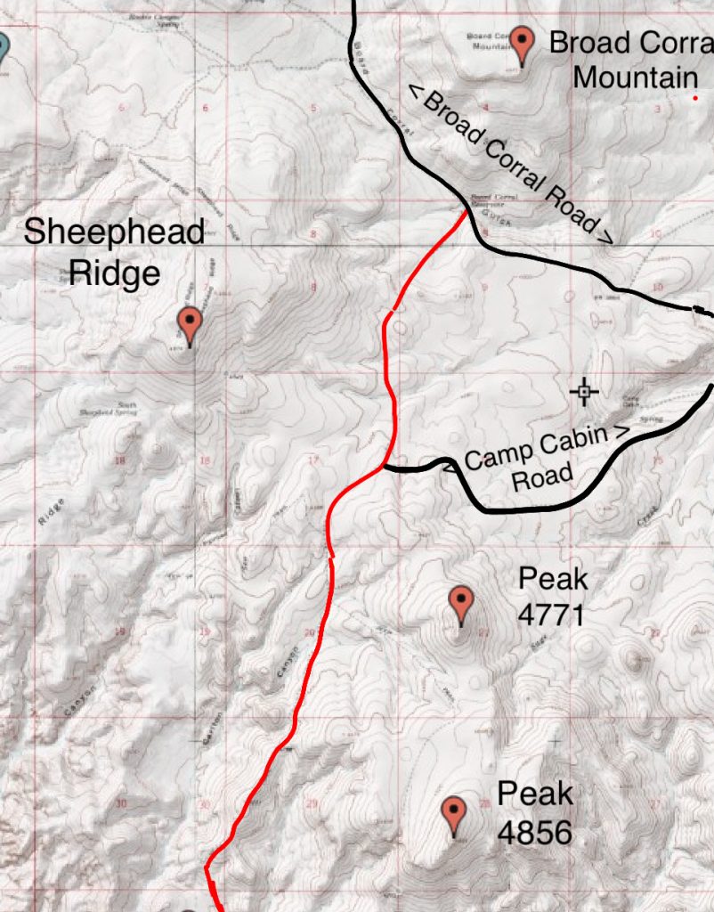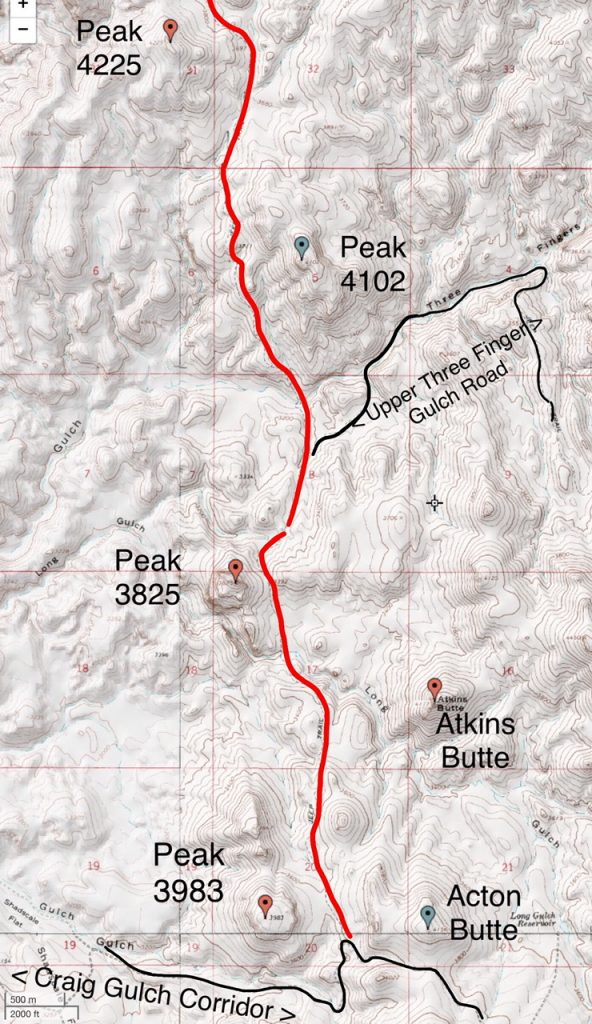 This road runs between the Broad Corral Road in the north and the Craig Gulch Road in the south. It can also be accessed from the Camp Cabin Road and the, extremely rugged and exposed Upper Three Finger Gulch Road.