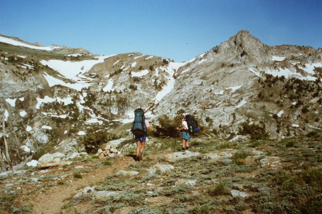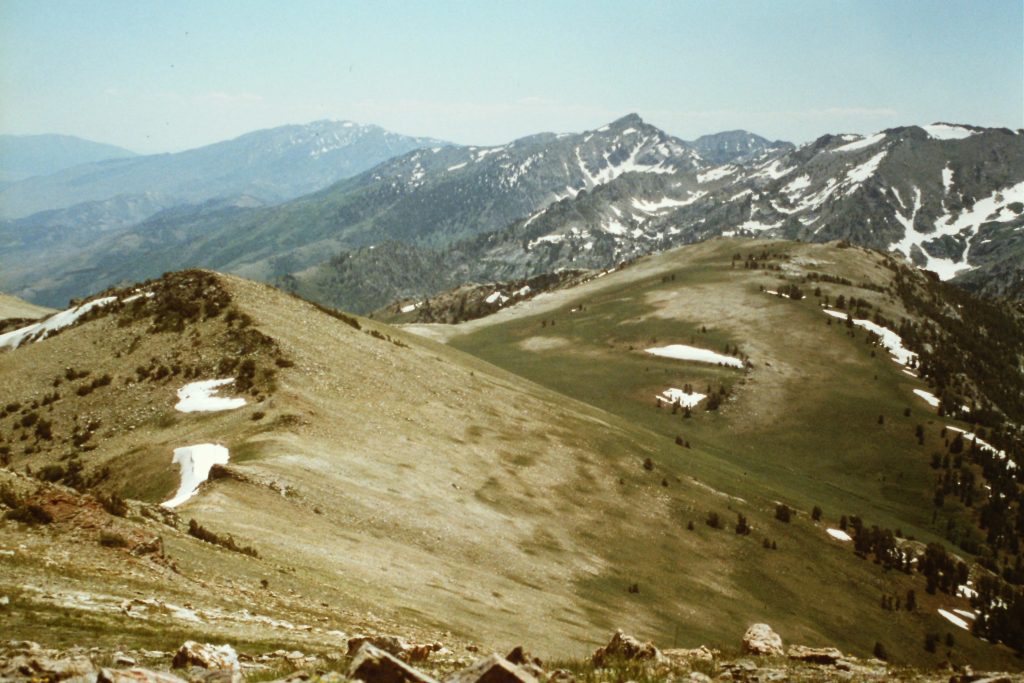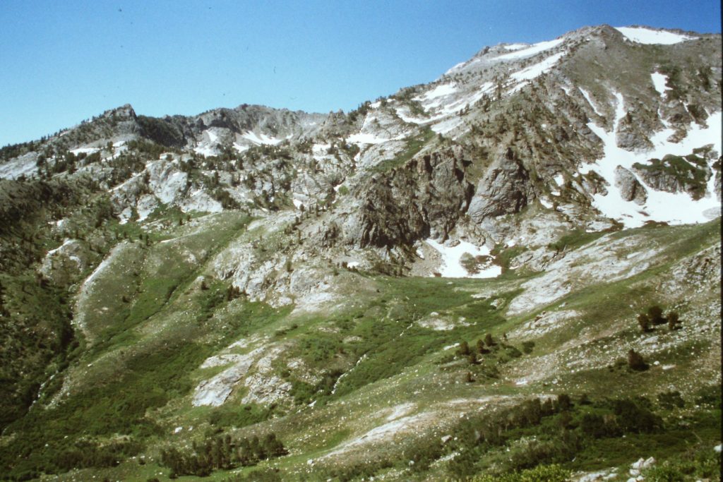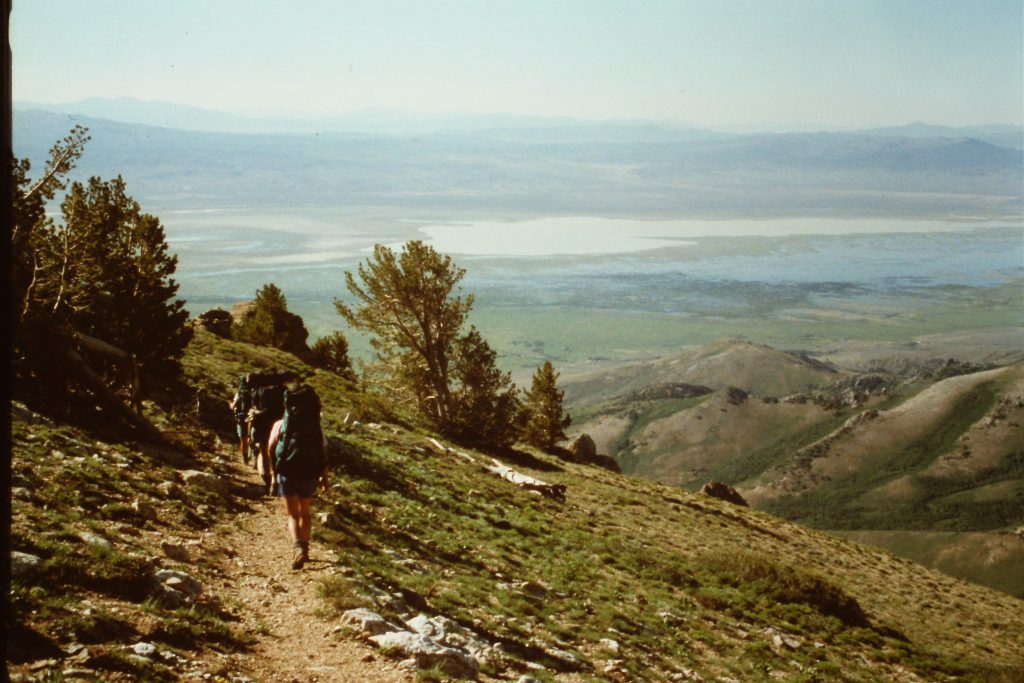 Over a long Fourth of July weekend in 1996, I hiked the Ruby Crest Trail from Lamoille Canyon to the Overland Lake Trailhead. This route (with side trips) covers roughly 30 miles. I hiked it with Dana Hanson, Basil Service and Becky Probst. We parked one vehicle at the south trailhead, spent a night in Elko and then drove to the Lamoille Canyon trailhead. From the north trailhead, the Ruby Crest Trail runs south for 43 miles to Harrison Pass. The trail crosses the most remarkable section of the very scenic Ruby Mountains. It also provides great access to many mountain lakes and high peaks.
