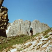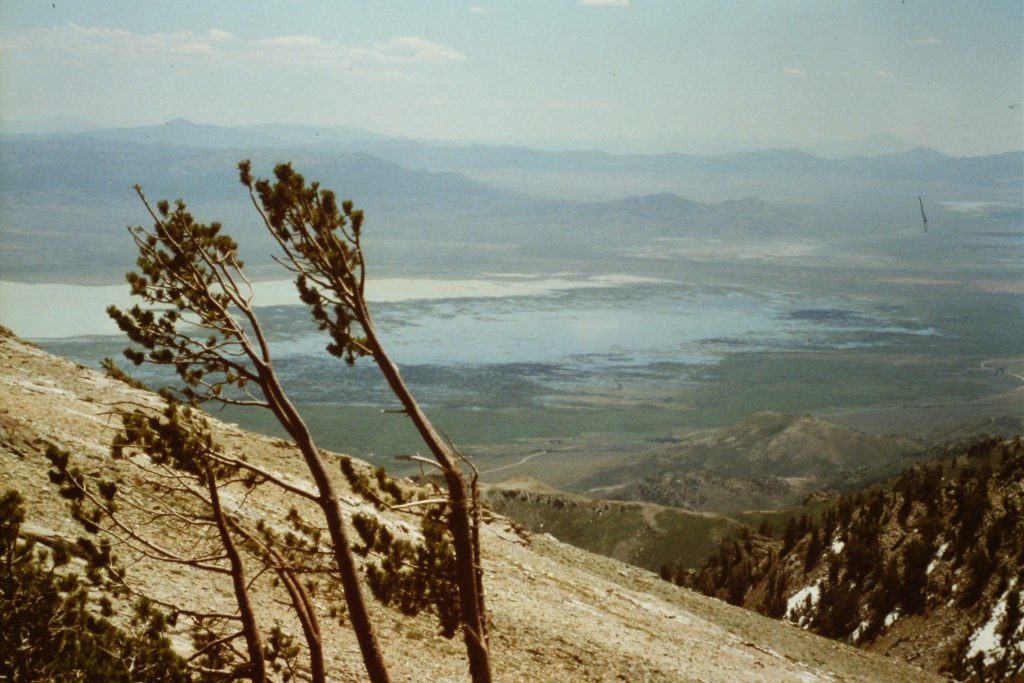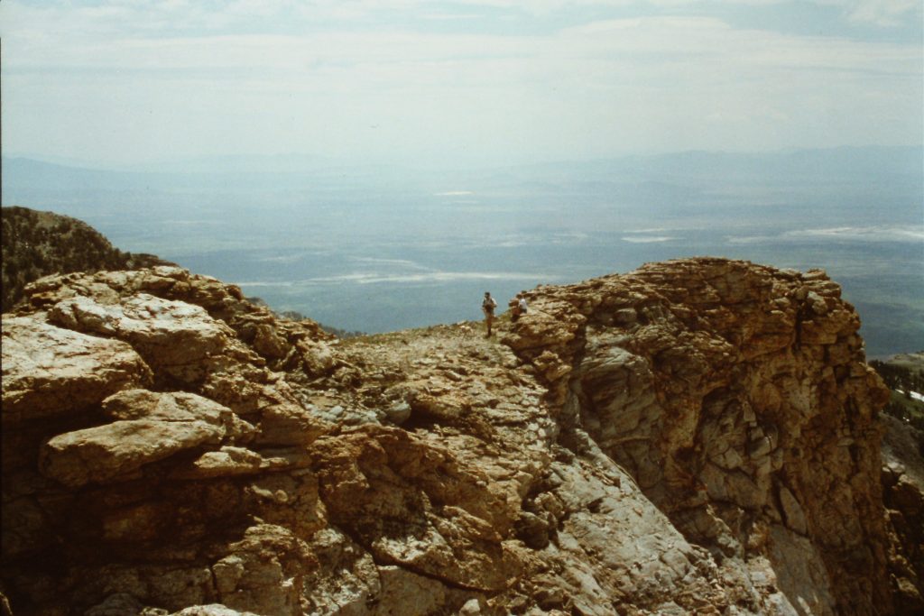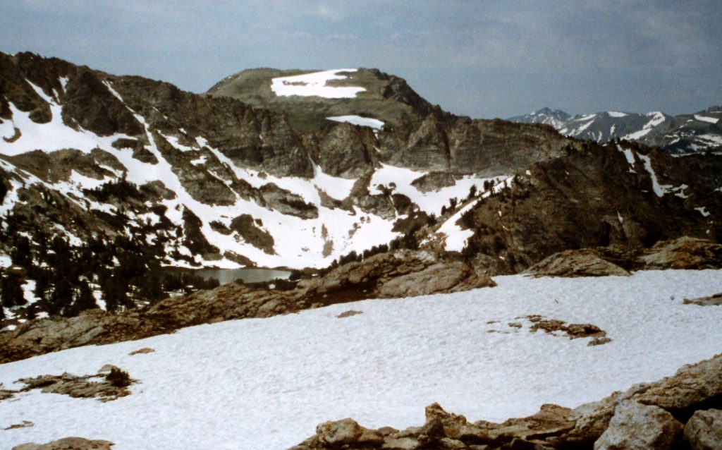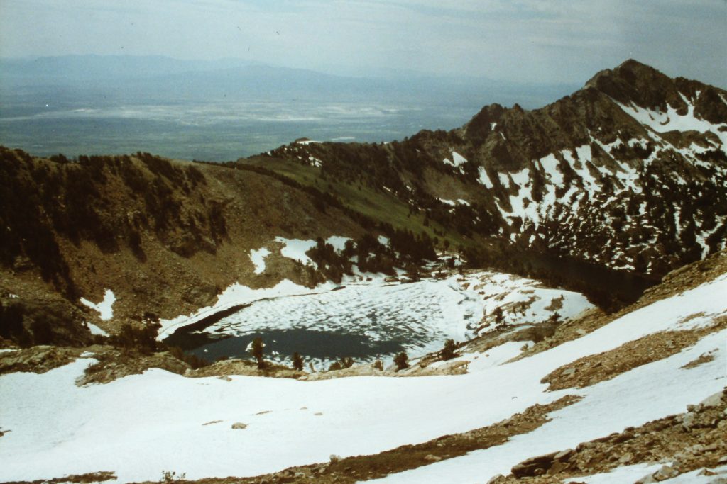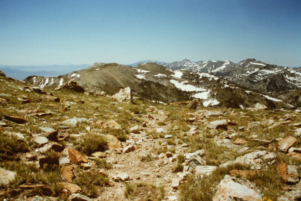 Over a long Fourth of July weekend in 1996, I hiked the Ruby Crest Trail from Lamoille Canyon to the Overland Lake Trailhead. This route (with side trips) covers roughly 30 miles. I hiked it with Dana Hanson, Basil Service and Becky Probst. We parked one vehicle at the south trailhead, spent a night in Elko and then drove to the Lamoille Canyon trailhead. From the north trailhead, the Ruby Crest Trail runs south for 43 miles to Harrison Pass. The trail crosses the most remarkable section of the very scenic Ruby Mountains. It also provides great access to many mountain lakes and high peaks.