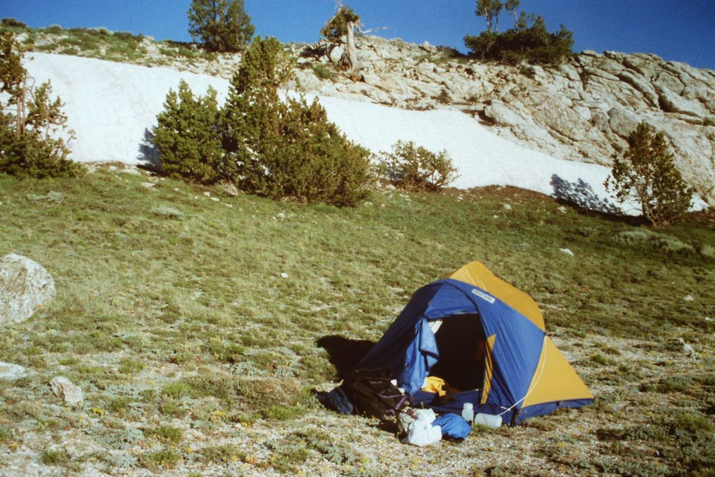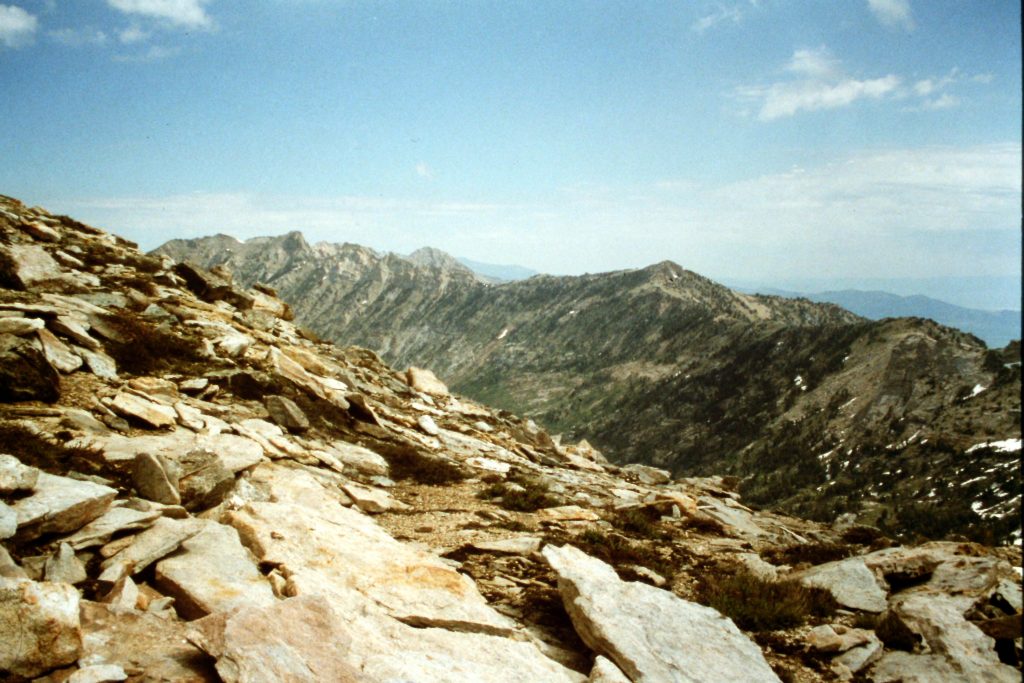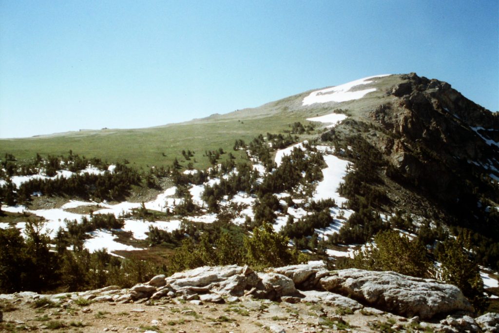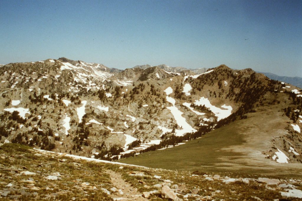 Day 2 took us out of the Kleckner Creek drainage over a pass located west of Lake Mountain into the North Furlong drainage. The trail stays high, only losing about 300 feet before climbing up to the crest north of Wines Peak (10,983 feet). From this point, the trail stays on the crest until it crosses over the summit of Peak 10120. Along the way, the trail crosses over 2 additional mountains (Peak 10760 and Peak 10756). The actual high points on these peaks are located just off the trail but are easily reached. After hiking 9 miles, we set up camp on the North Side of Peak 10207. A large melting snowdrift provided us with water and allowed us to camp at 9,800 feet just west of the trail. The trail across this section is as scenic as any spot that you can imagine. The hiking was on a good trail. The vistas were always amazing.