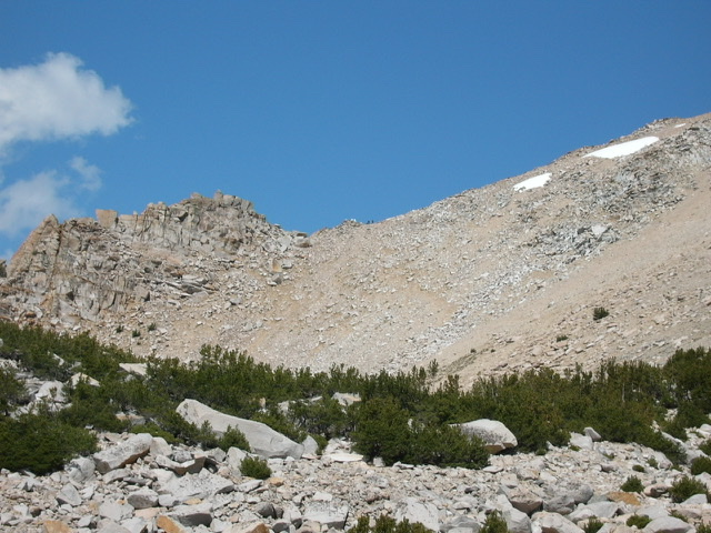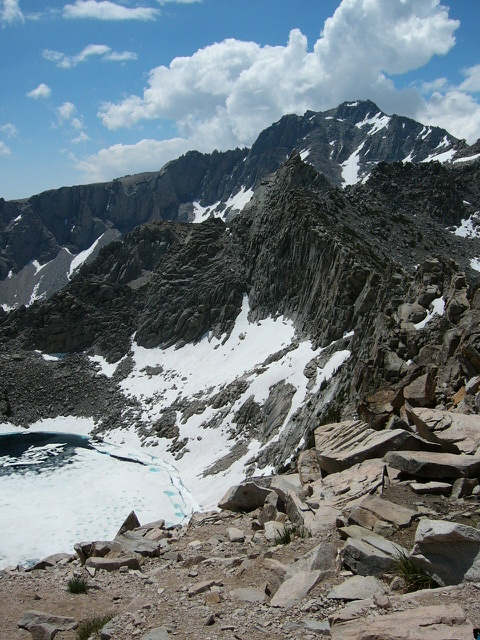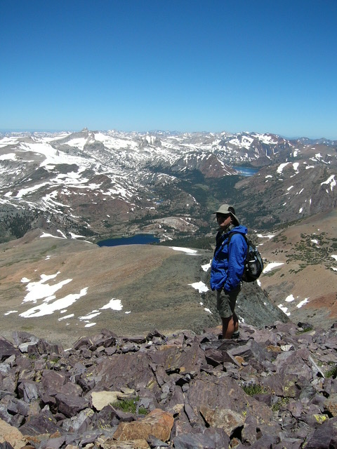 July 10th. Mount Starr, 12,835 feet, was first climbed was named after Walter Starr. Starr, along with Alan Chickering, made the first recorded ascent in 1896. The High Sierra guidebook by Secor described the route as Class 2. The route was a bit more difficult because the summit is festooned with granite boulders and towers. While all of these obstacles can be avoided, they obscure the true summit. We had to climb several in order to orientate before eventually found the summit.