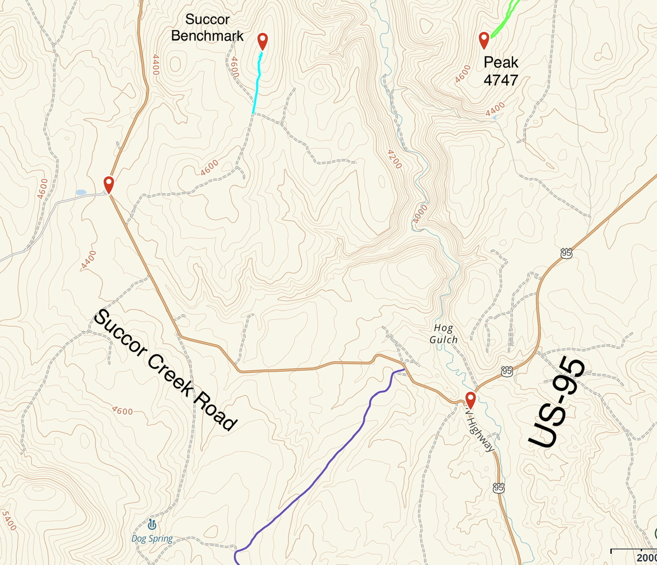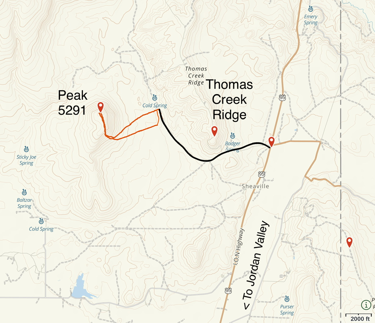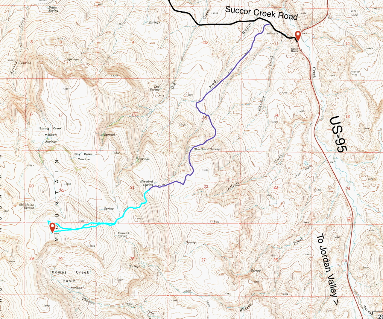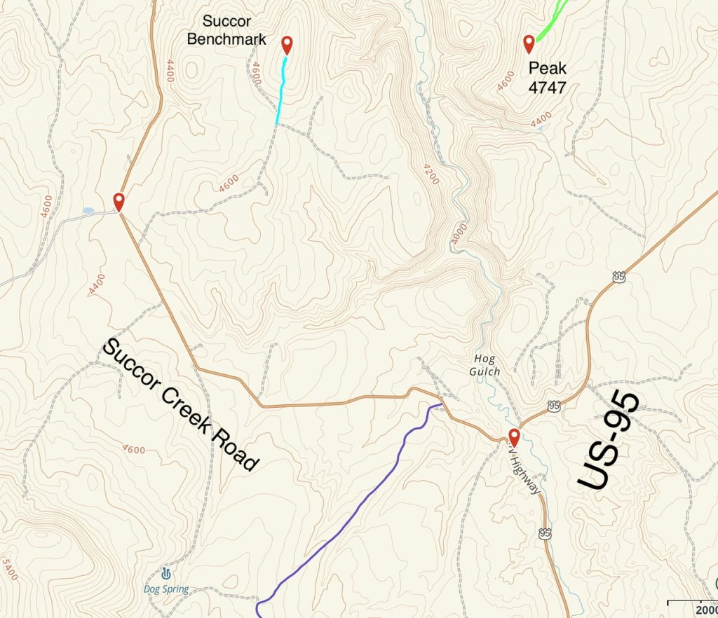 Spring Mountain is a big, hulking mountain located southeast of Mahogany Mountain. It has many high points with the highest topping out at 5,988 feet. Private property limits the possible ascent routes. Access the peak from the south end of Succor Creek Road. Roughly 0.5 miles west of US-95, turn south onto a sketchy 4WD road and follow it until the road reaches a broad saddle west of Point 5071. Turn west on another 4WD road that climbs to Hereford Springs. The road continues onto private property at this point. Park here and follow the GPS track shown on the map below. This route covers 3.8 miles with 750 feet of elevation gain round trip.