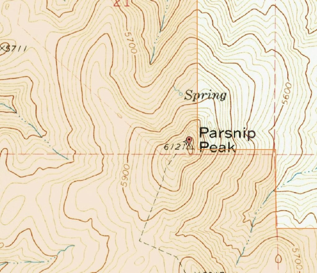 As shown on the map below, the land status map and the fencing on the ground do not match up for Parsnip Peak. According to the land status map, the summit is on BLM land if you approach from the west. However, there is a fence 200 feet west of the peak’s high point that is festooned with “No Trespassing” sign. Either the fence or the land status map is wrong. I believe the summit and fence are both located on BLM-managed land and you can legally access the summit.